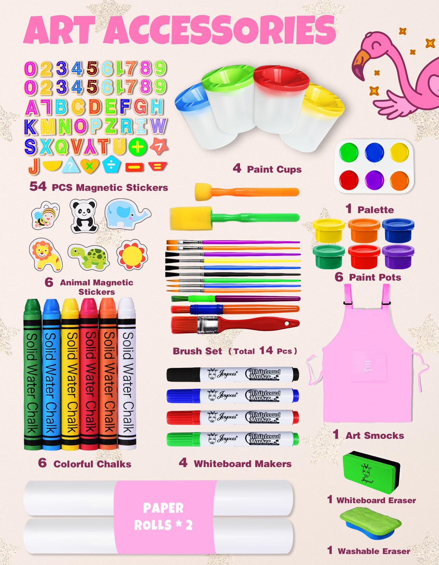 - 【All In One Kid Easel Accessories】Our art easel for kids easel offers a complete experience of over 98 accessories. Including 2 paper rolls, 6 paint cans, 14 brushes and 1 set of color palettes, 1 art apron, 1 box of chalk, 4 whiteboard pens, 1 whiteboard eraser, 1 washable eraser, 4 painting cups, a set of colored magnetic letters and mathematics, meeting the needs of painting and learning. The magnetic board for kids make the easel very suitable for indoor and outdoor painting.