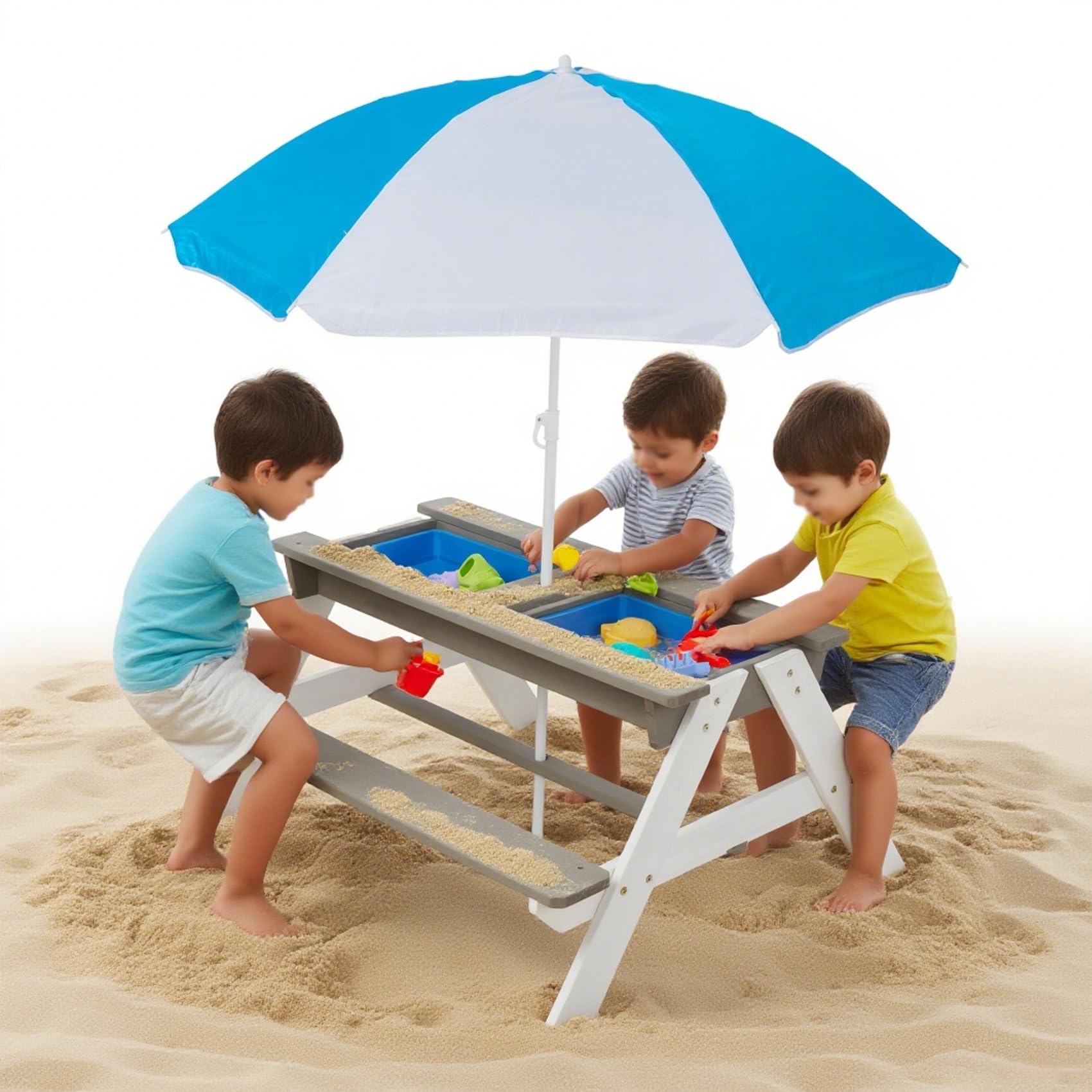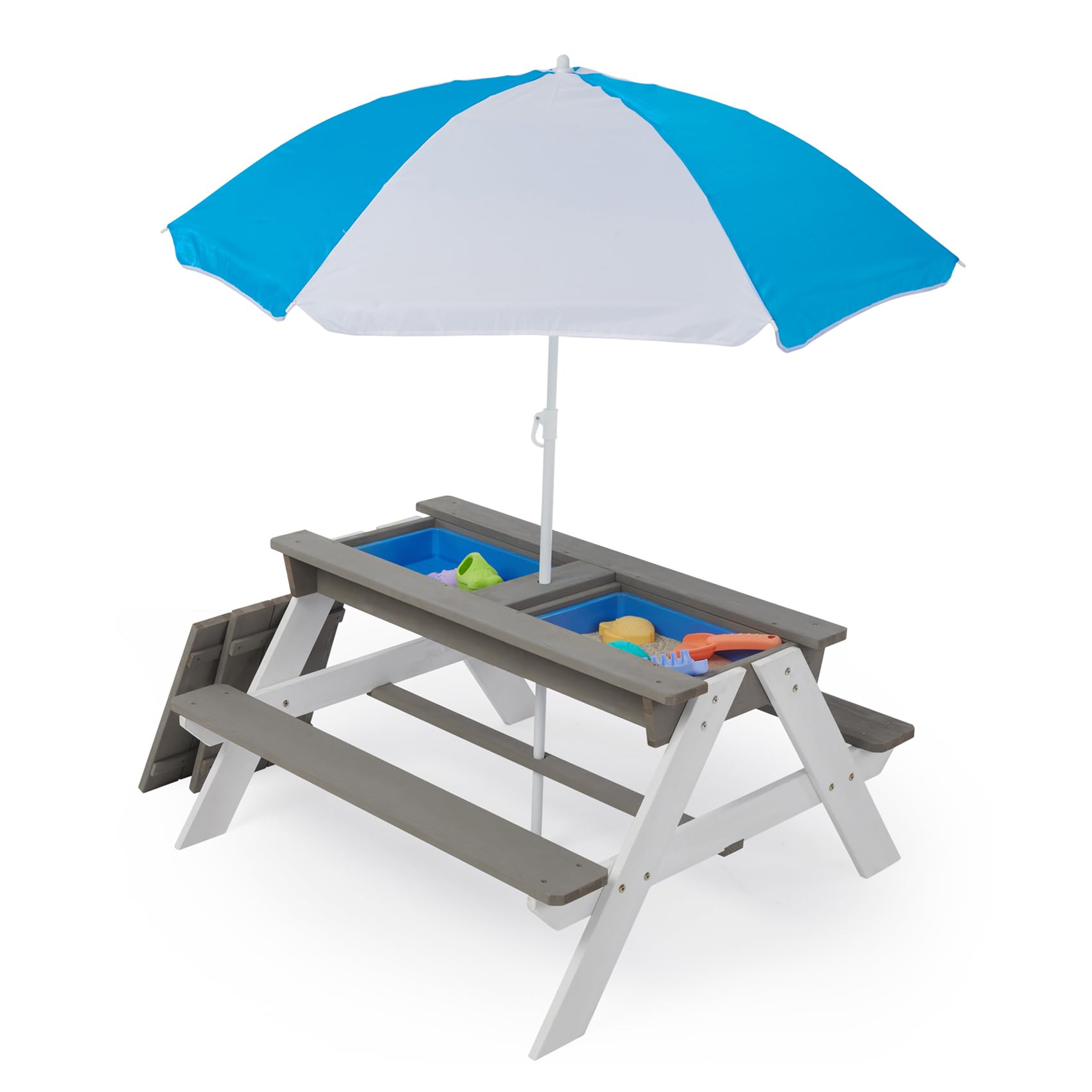 - The kids Picnic Table With Umbrella serves as a multifunctional picnic table, play area, and storage solution with removable playboxes, accommodating all forms of play and dining needs.