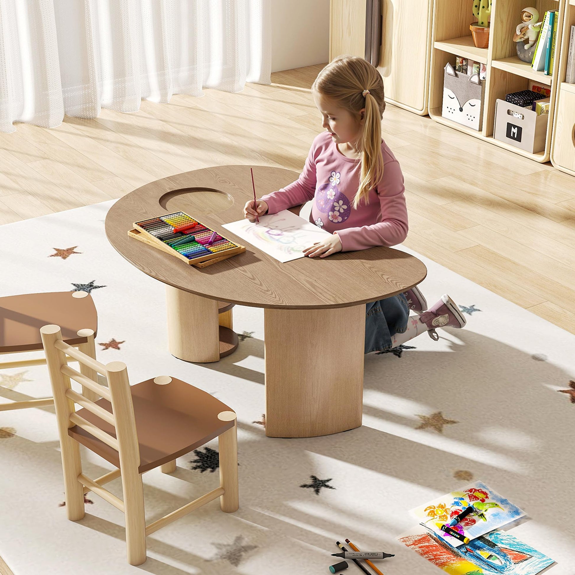 - Cute Moon Shape: This half-moon shaped wooden train table combines aesthetics with practicality, naturally dividing individual study and parent-child interaction zones sparking imagination and artistry