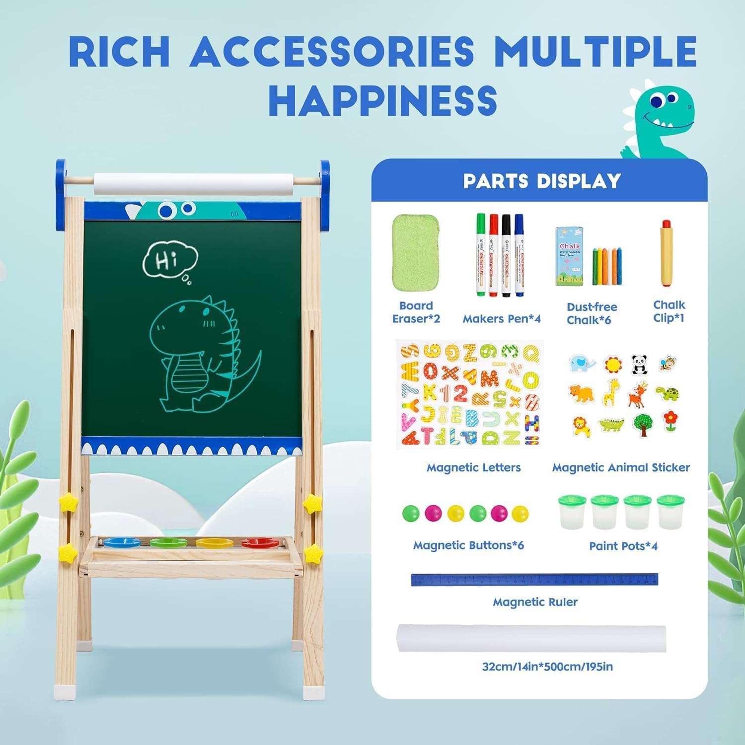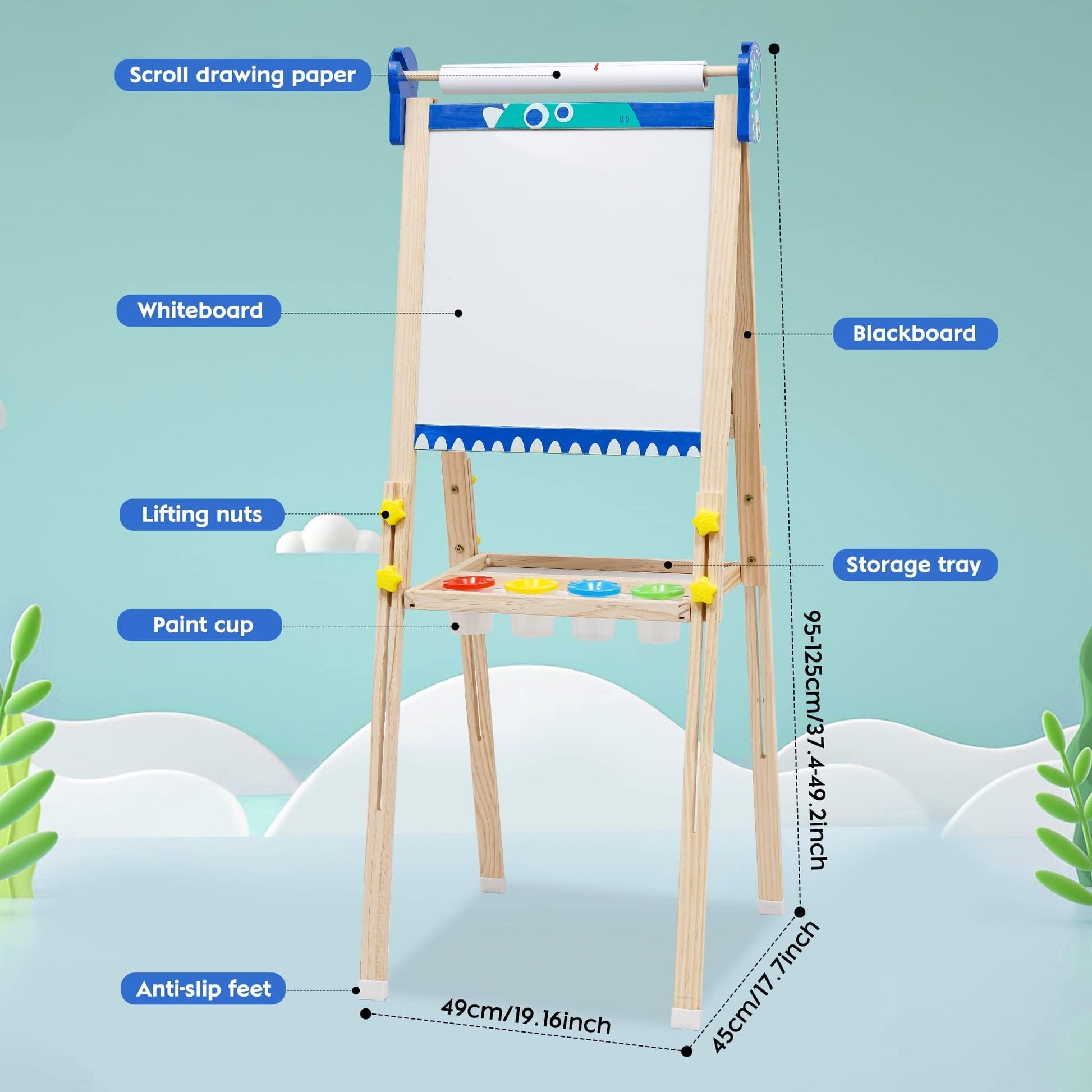Kids Wooden Art Easel with Paper Roll,Foldable Double-Sided Easel with Whiteboard & Chalkboard,Height-Adjustable Drawing Board for Girls Boys Toddlers Aged 3-5/4-8,Ideal Gift for Christmas,Birthday