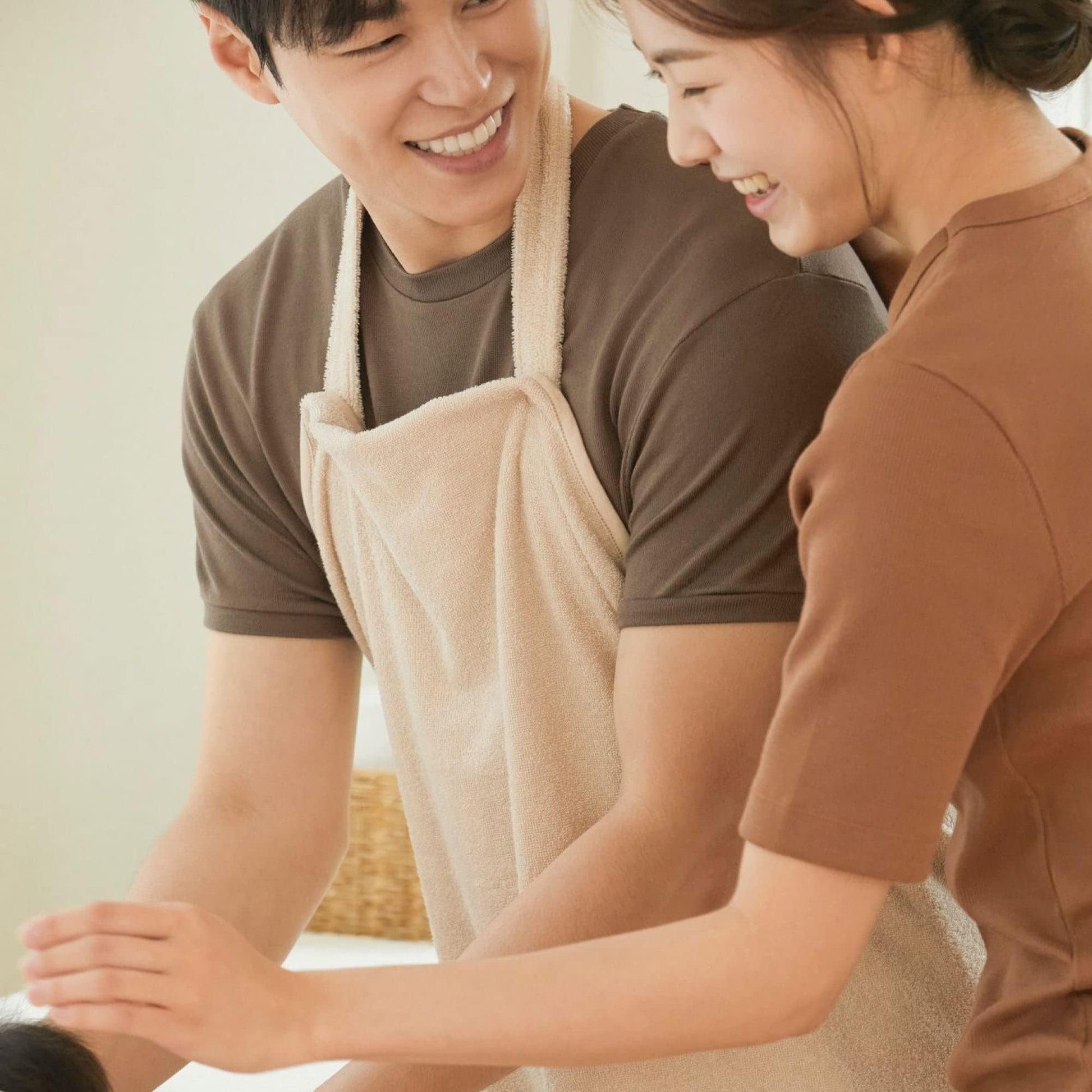 - This towel prevents parents from getting wet on clothes while wrapping a baby right after bathing. Wear it like an apron and pat dry as soon as the bath finishes. No need to worry about finding a towel to dry your soaked baby after the bath.
