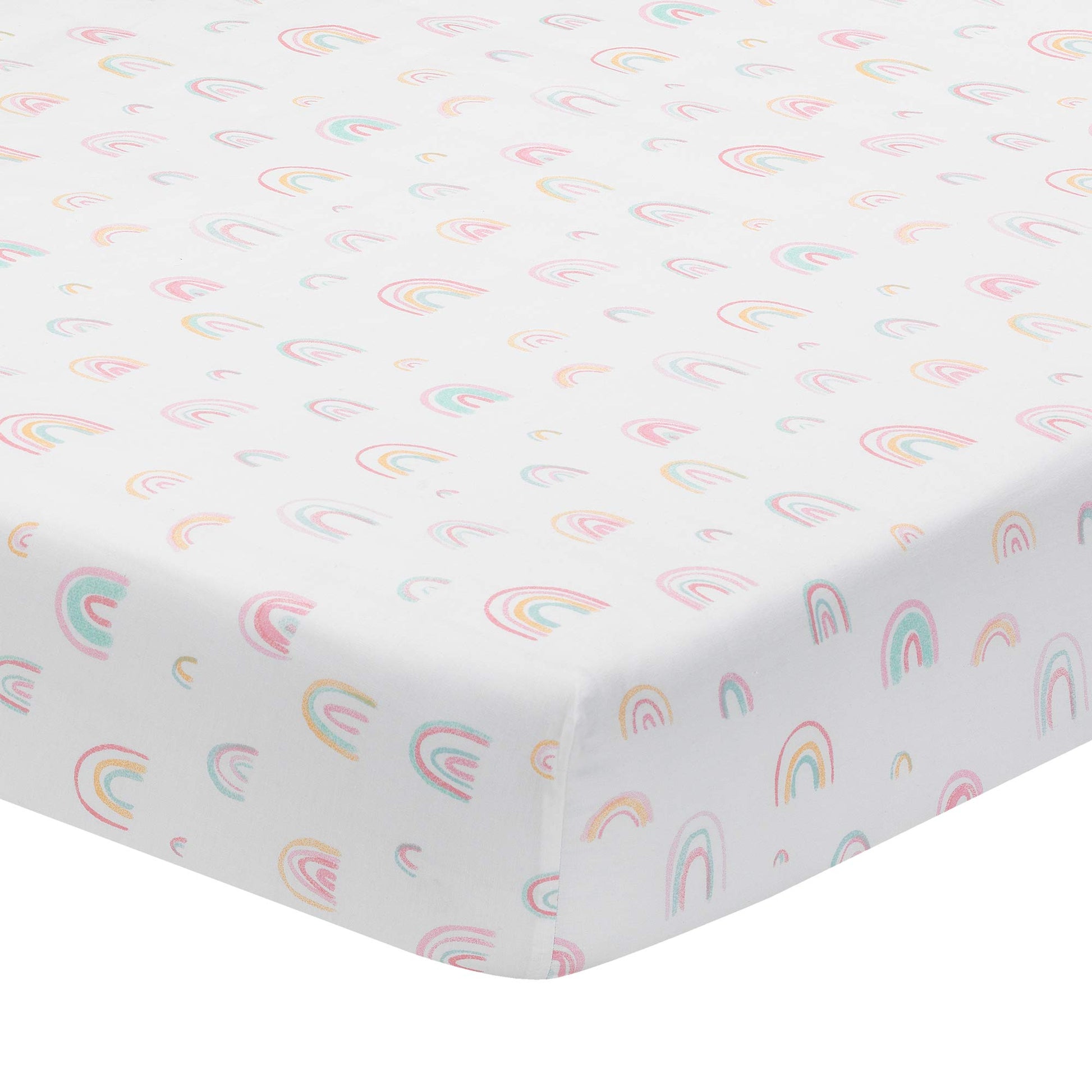 - Two darling, breathable 100% cotton fitted crib sheets. One features rainbow watercolor elephants and the other features beautiful watercolor rainbows