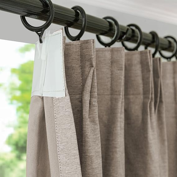 - Pinch pleated blackout panel, hooks including in the package, good for track and pole which has eyelet rings.