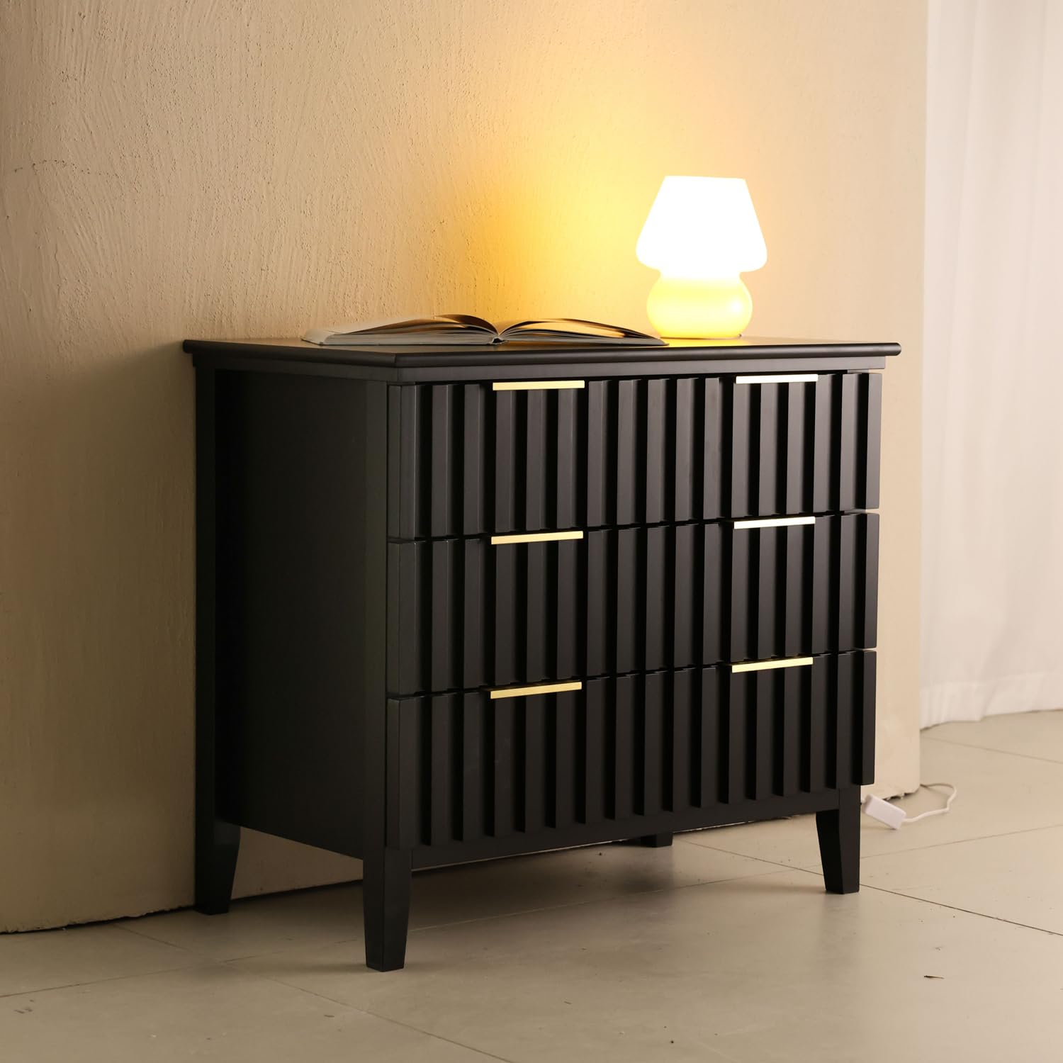 - Our 3 Drawer Dresser features a stunning fluted drawer front, adding a touch of sophistication and elegance to any room.Crafted from high-quality wood dresser with a sleek black finish, complemented by golden metal handles,not only enhances the aesthetic appeal but also provides a unique and stylish look.