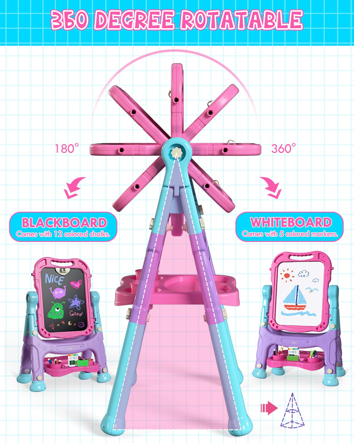 - 360° Double-Sided Rotatable: Our art easel features a chalkboard on one side and a whiteboard on the other, perfect for two kids to use simultaneously. The reversible board allows easy access from any angle for drawing, writing, and painting
