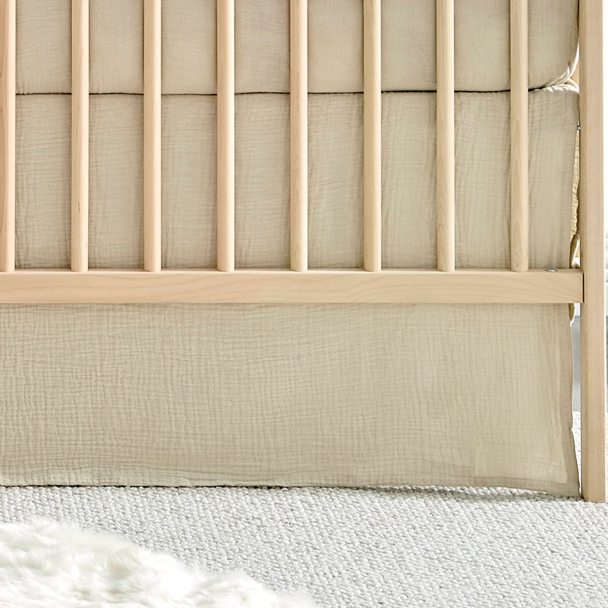 - GENDER NEUTRAL BABY ACCESSORIES: The beige color palette of the Cloud Muslin dust ruffle is minimalist luxury, making this dust ruffle, or any of the nursery accessories that coordinate with it, the perfect baby shower gift or accent for a new nursery.