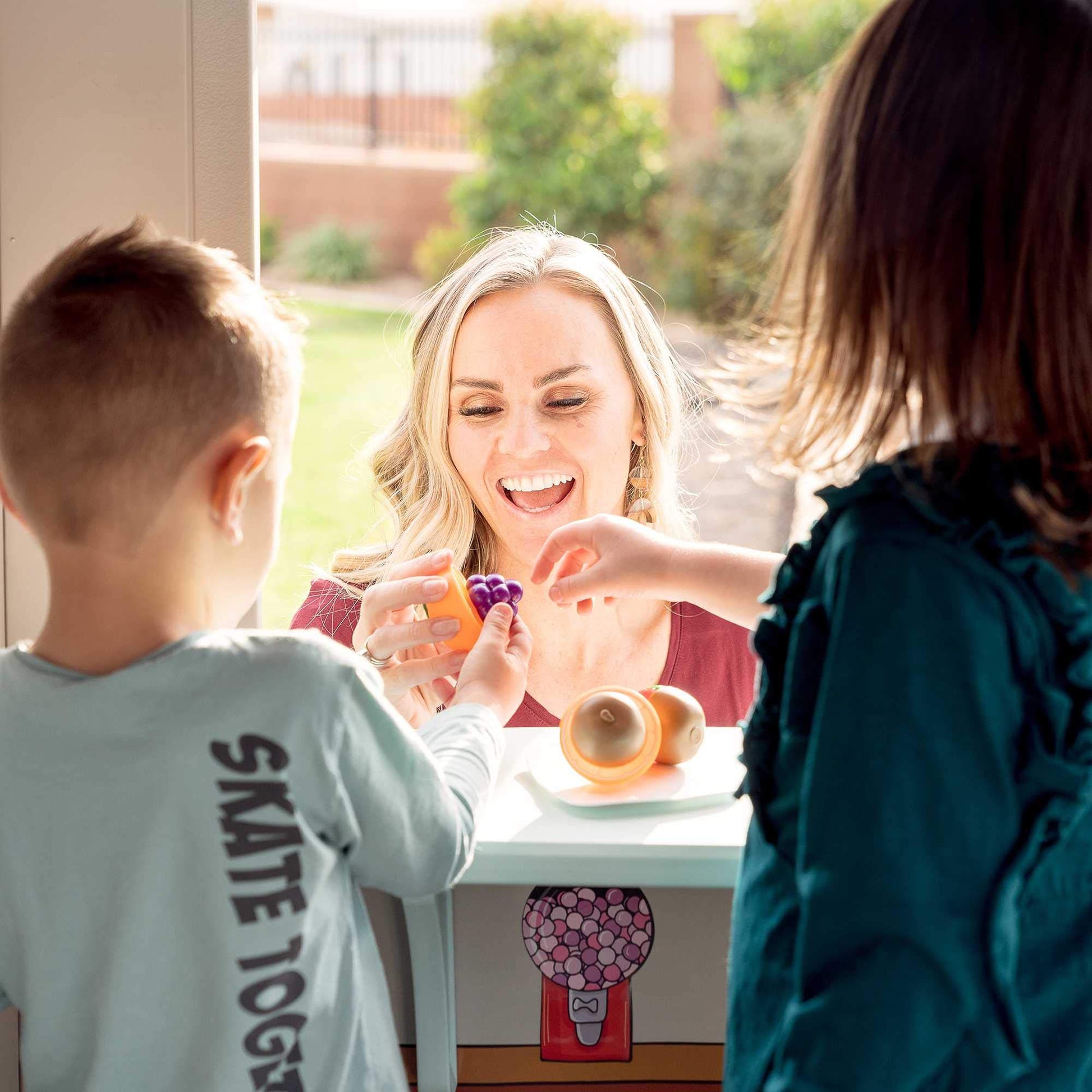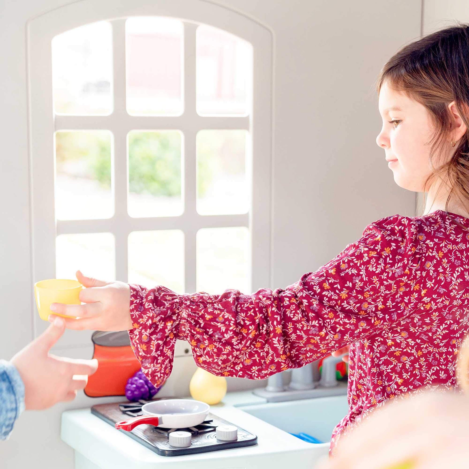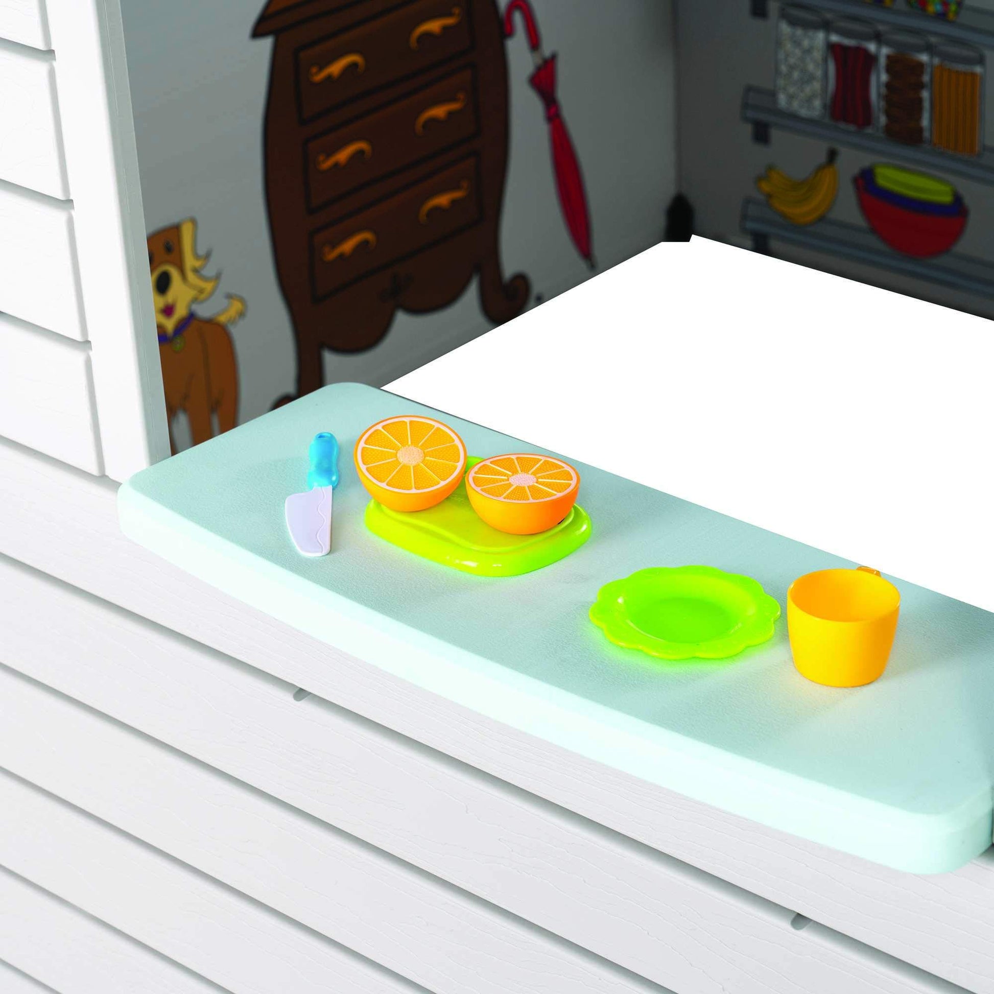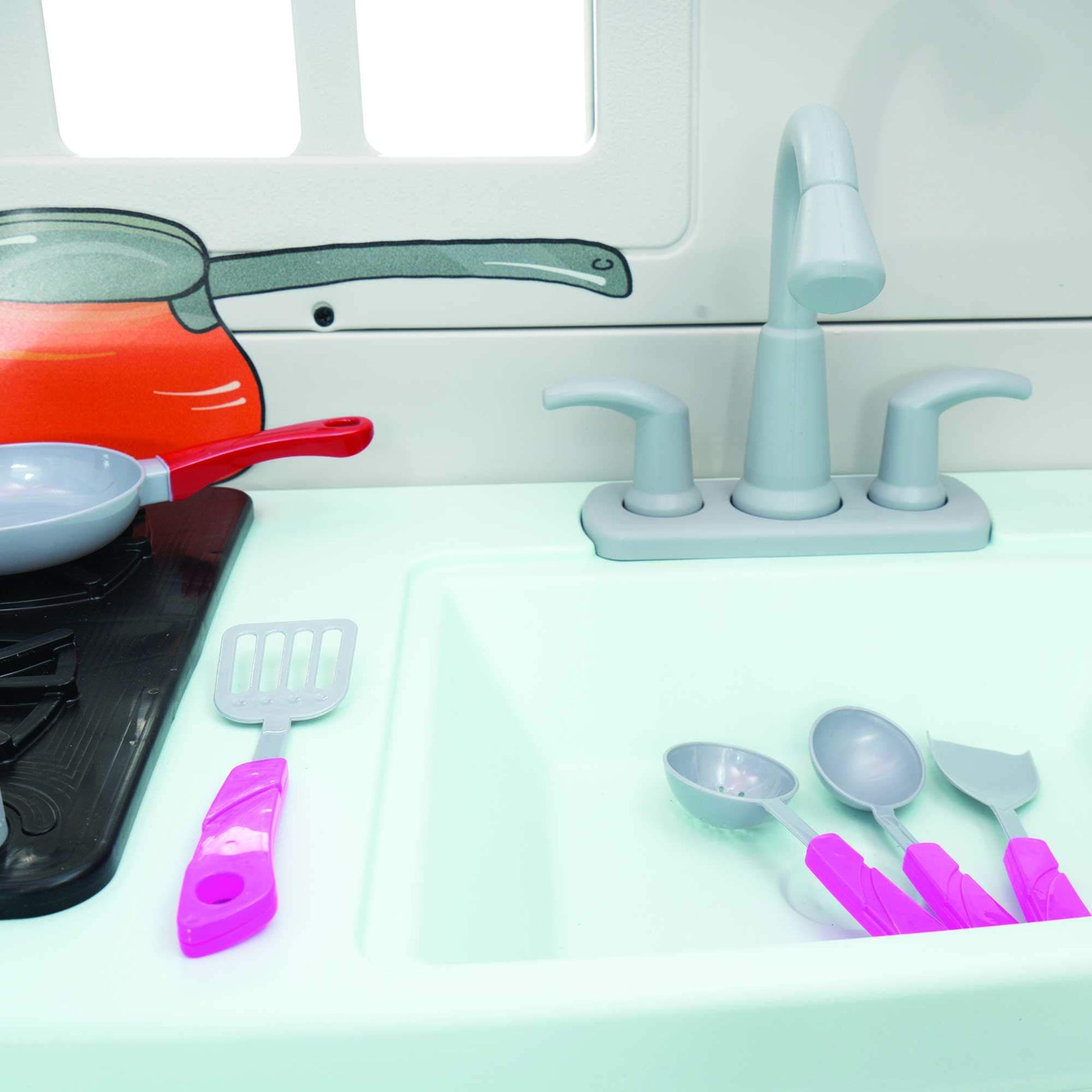 - Door with mail slot and working doorbell, play sink and stove combo, toy food, pans, and utensils included