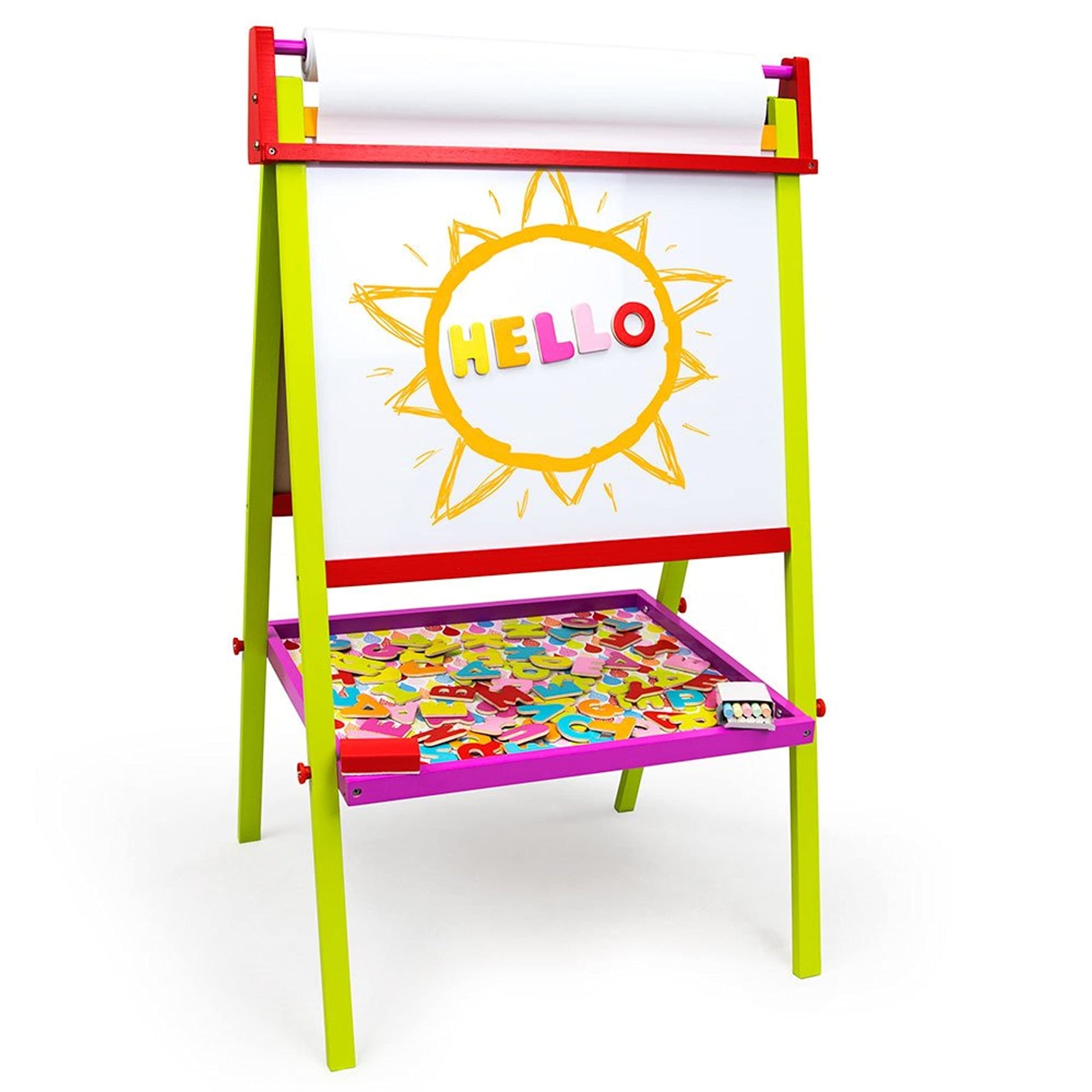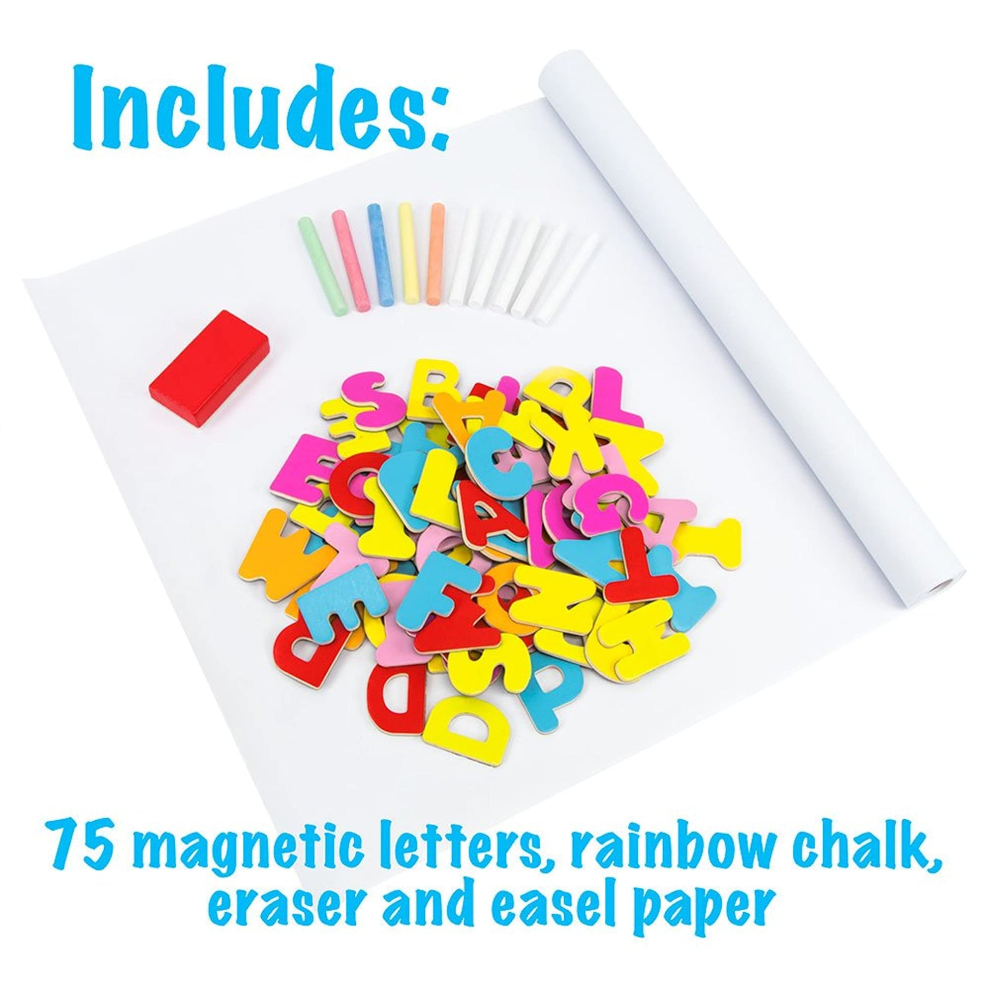 - COMPLETE STUDIO: Includes 75 magnetic letters, a roll of easel paper, rainbow chalk and a chalk eraser