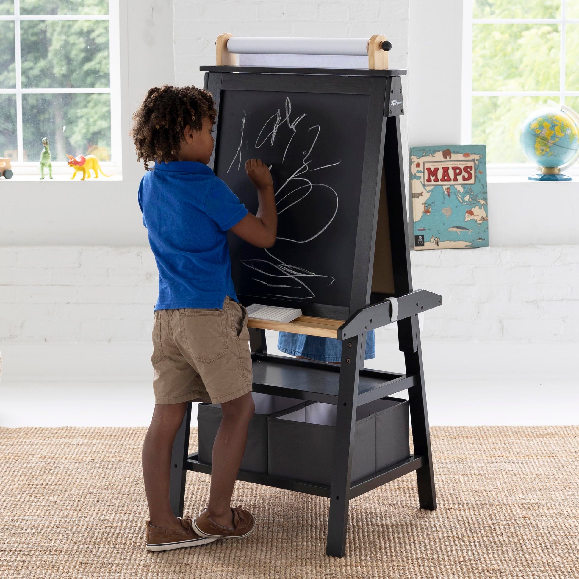 - All-in-One Art Easel: Deluxe dual sided toddler art easel features a chalkboard, magnetic dry erase board, and a paper feed for rolling down a canvas for drawing; Kids easels for toddlers gives your little one space to color, paint, and play with various mediums