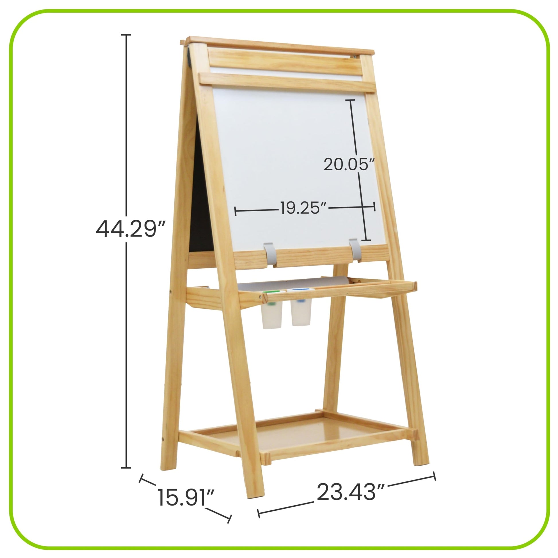 - Specifications: Assembly is required and tools are included with the kids easel; For care, wipe clean with a damp cloth; Dimensions are 23.43" (W) x 44.29" (H) x 19.29" (D); Limited lifetime warranty
