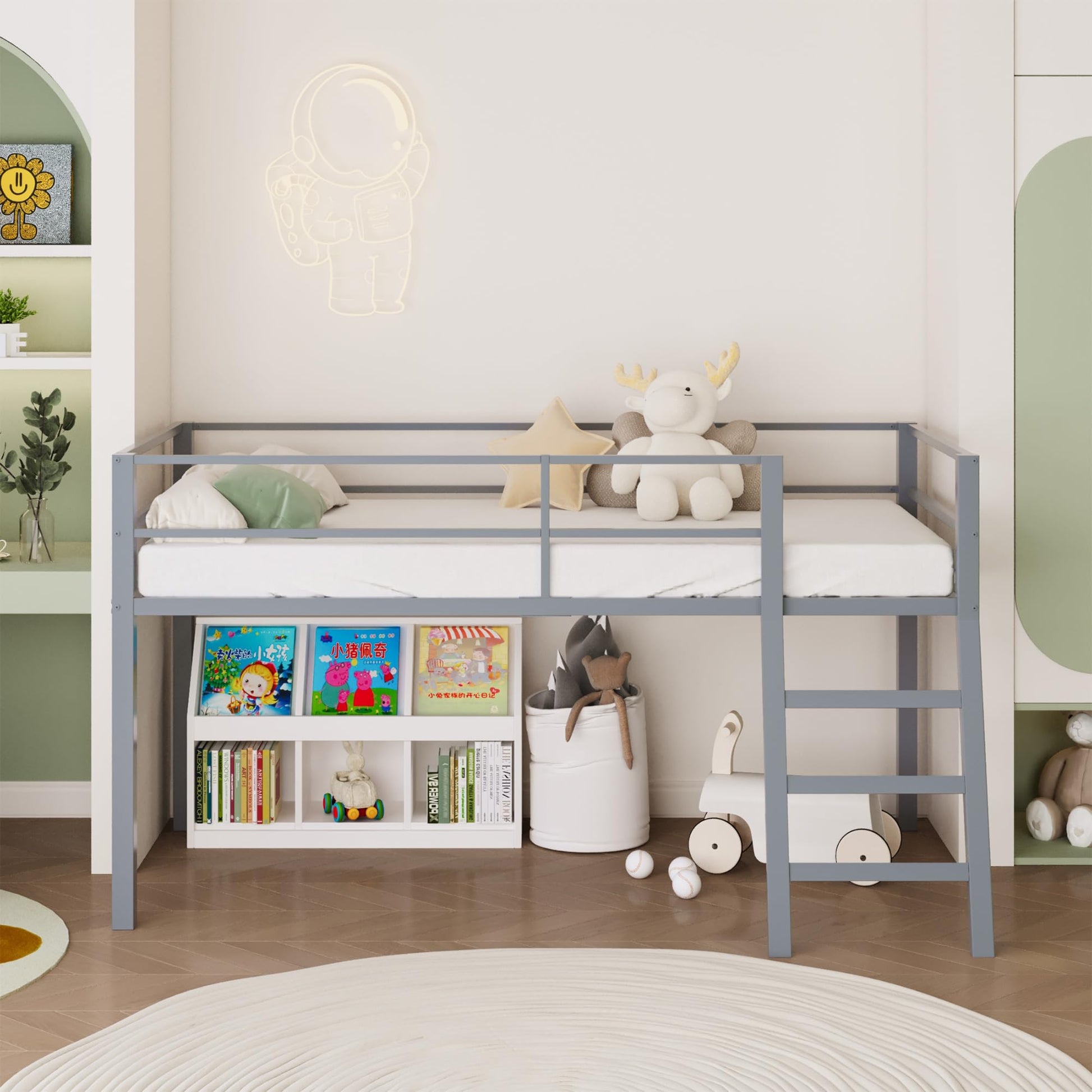 - Stair with Ramp: The ladder of this low loft bed is design in ramp structure and will easy for your kids to climb into and out of bed.