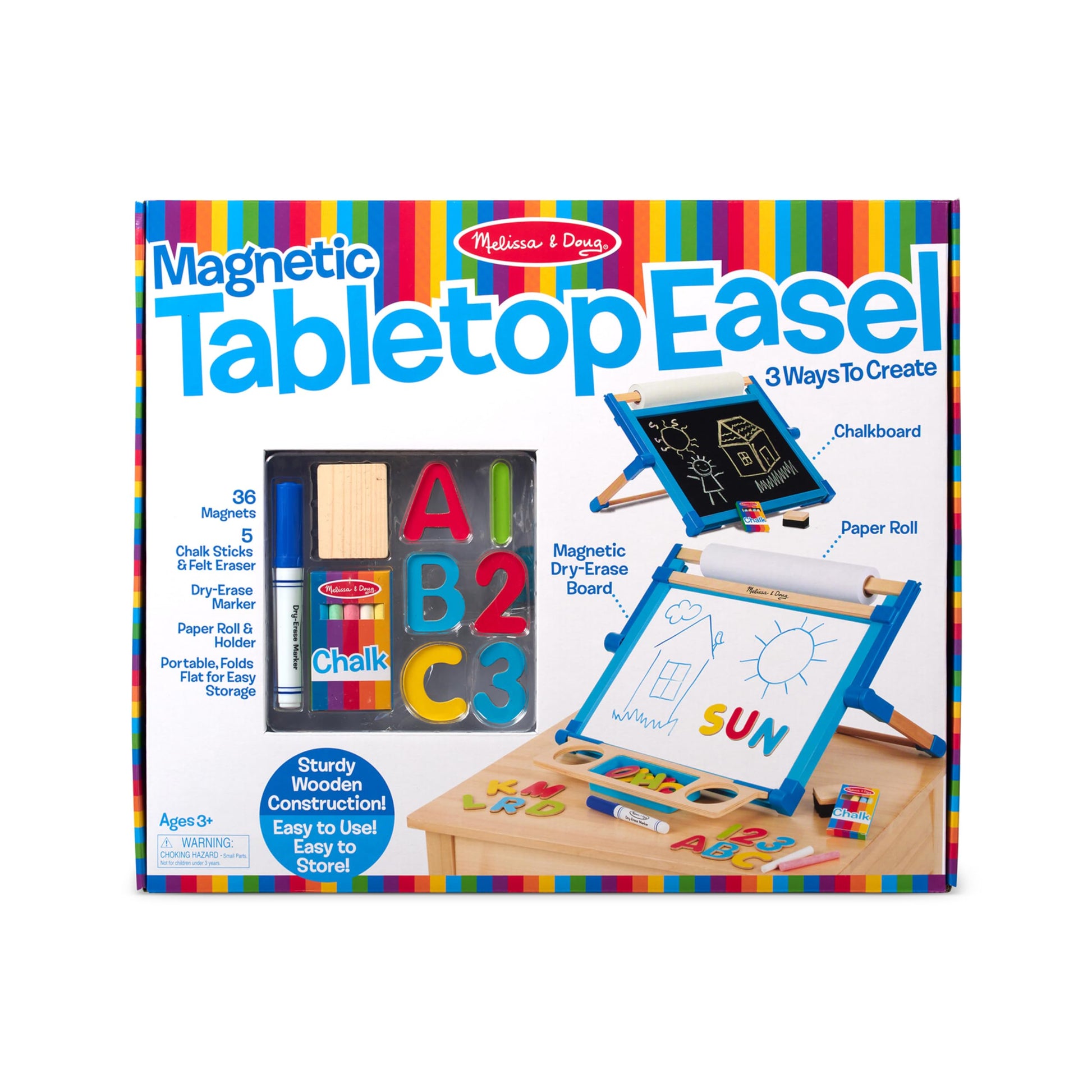 - Sturdy wooden double-sided tabletop art easel that folds flat to store