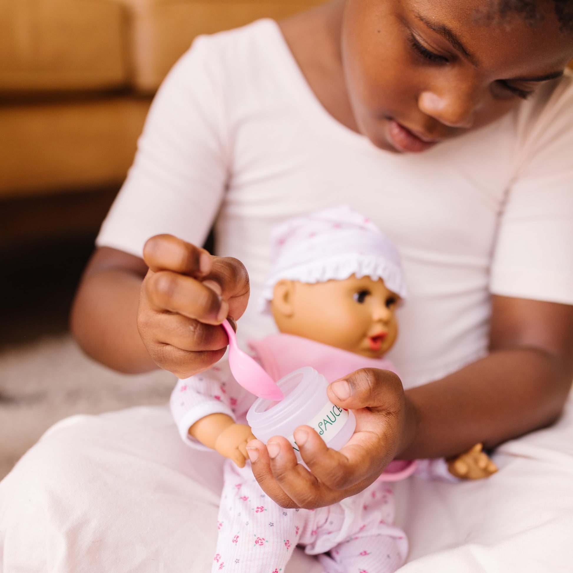 - Feeding set includes easy-close embroidered bib, disappearing orange juice and milk bottles, divided dish, 2 jars of pretend food, spoon, and spork