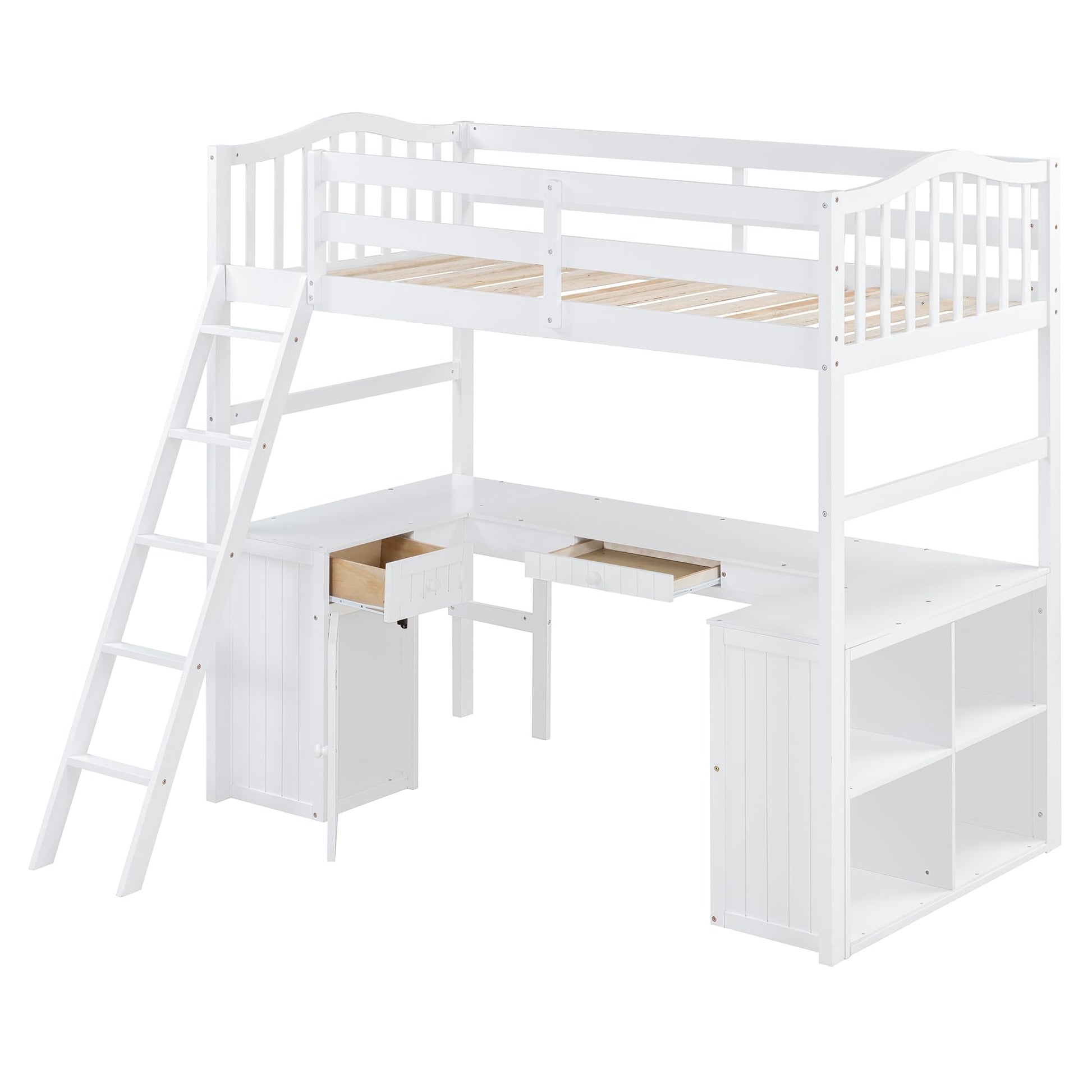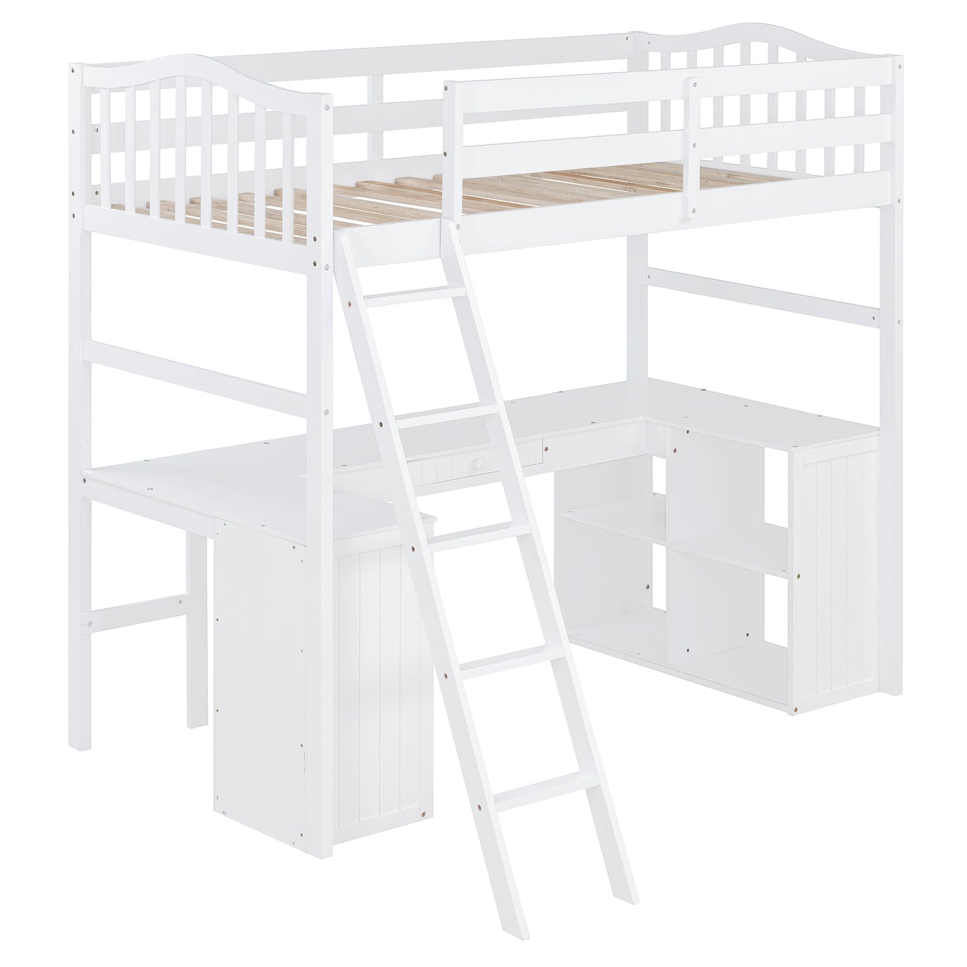 - [Versatility galore] The space underneath the twin-size loft bed is a good place for you to read, do homework or play and create your own world to be explored. Coming with drawers, spacious bookshelves, a cabinet, and a desk, the loft bed helps to store books, display decorations, or to place a laptop.