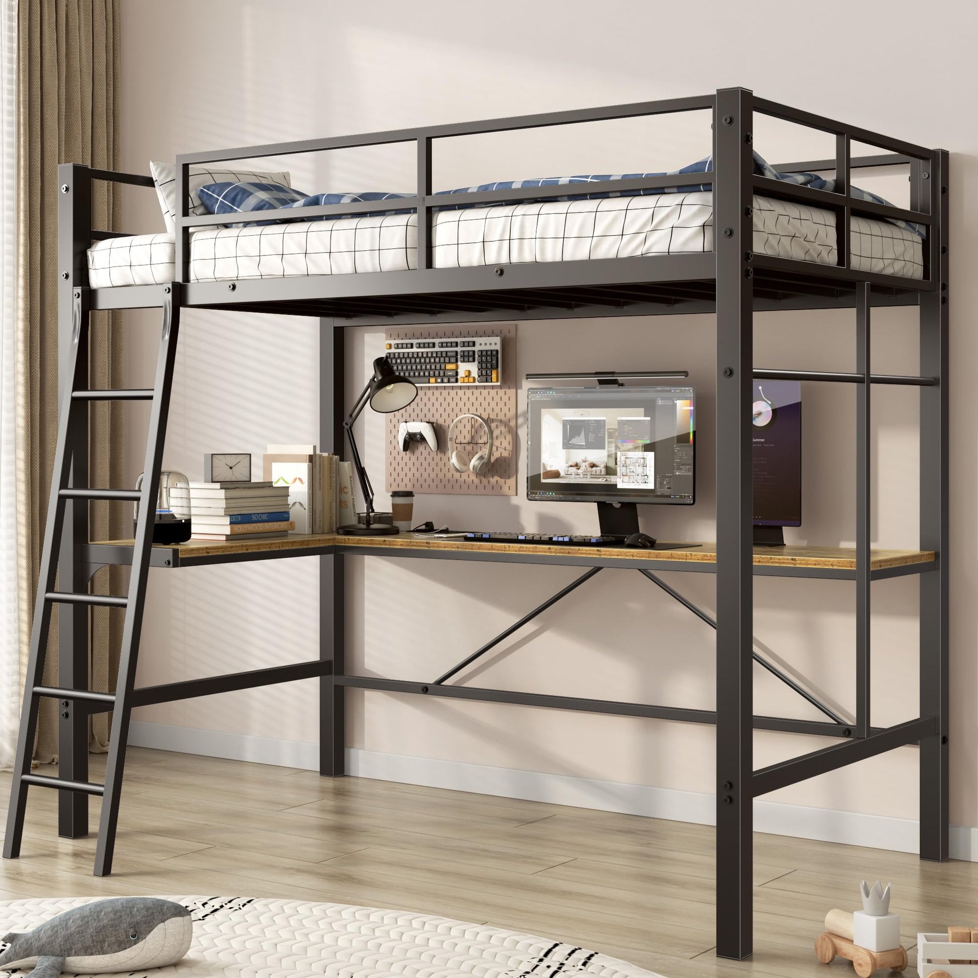 Metal Loft Bed Twin Size with Desk, Heavy Duty Twin Bed Frame