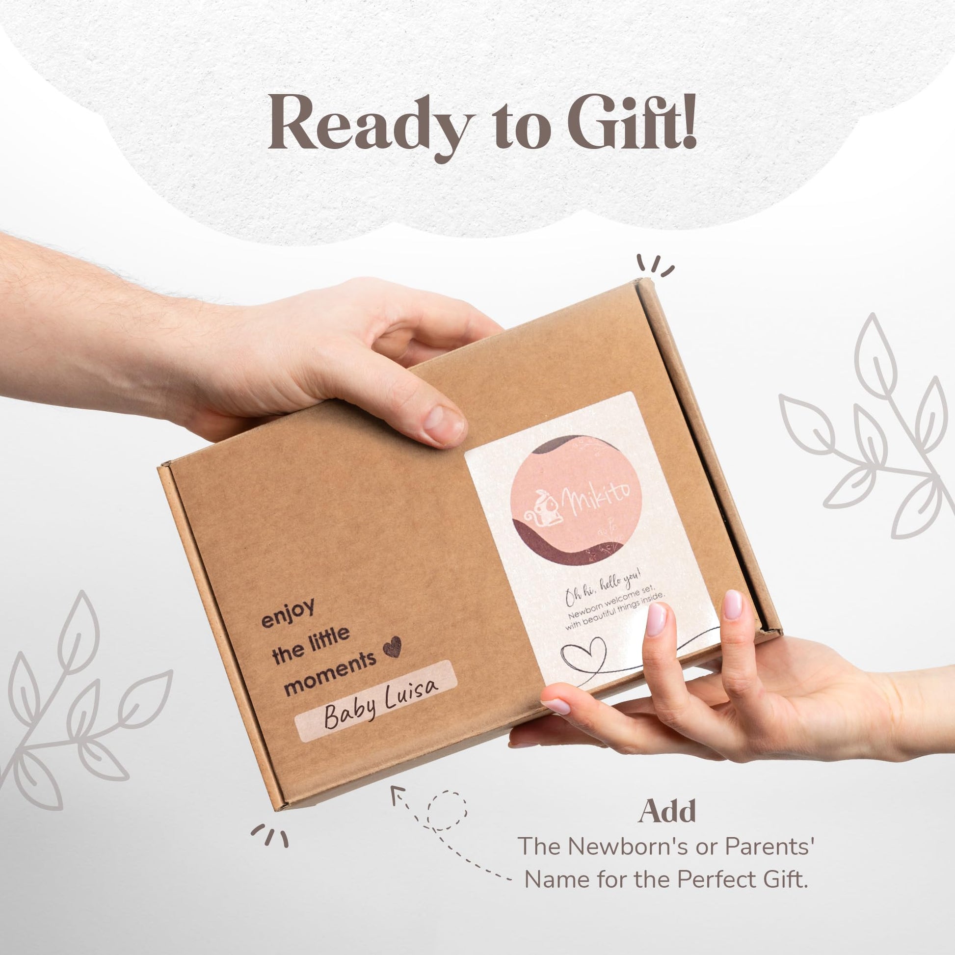 Mikito Organic Cotton Newborn Gift Box, Unisex Baby Gift Set incl. Muslin Lovey Comforter + Bandana Bib + Wooden Teether + Birth Announcement Sign