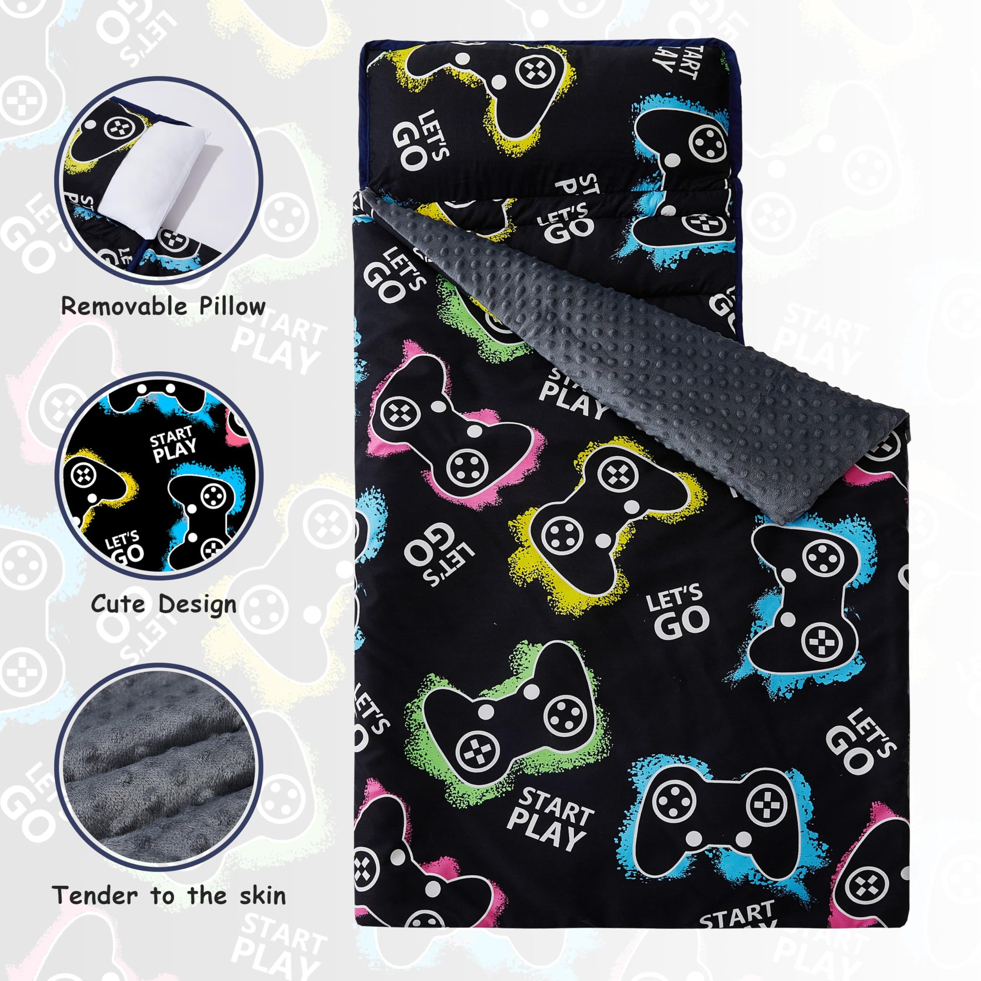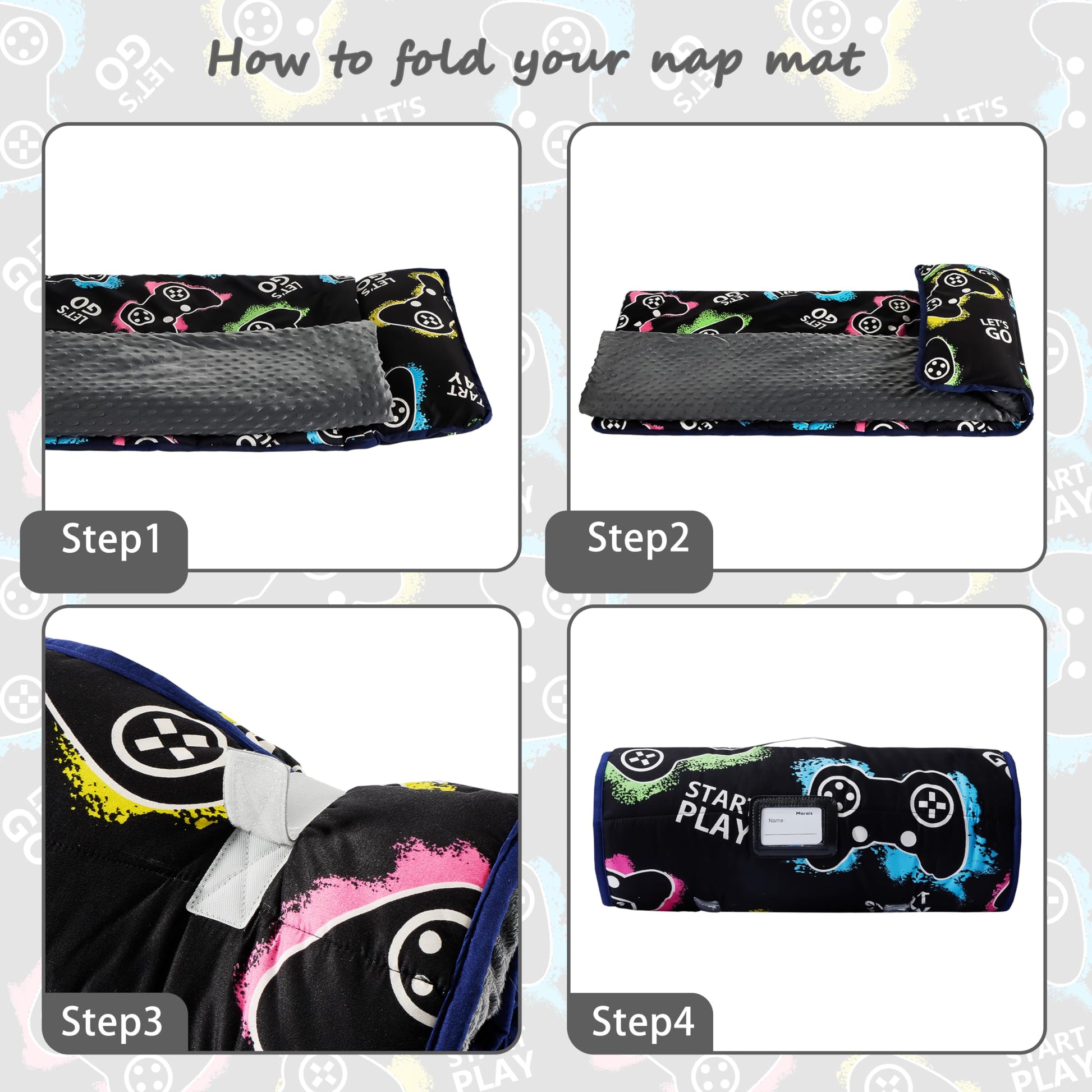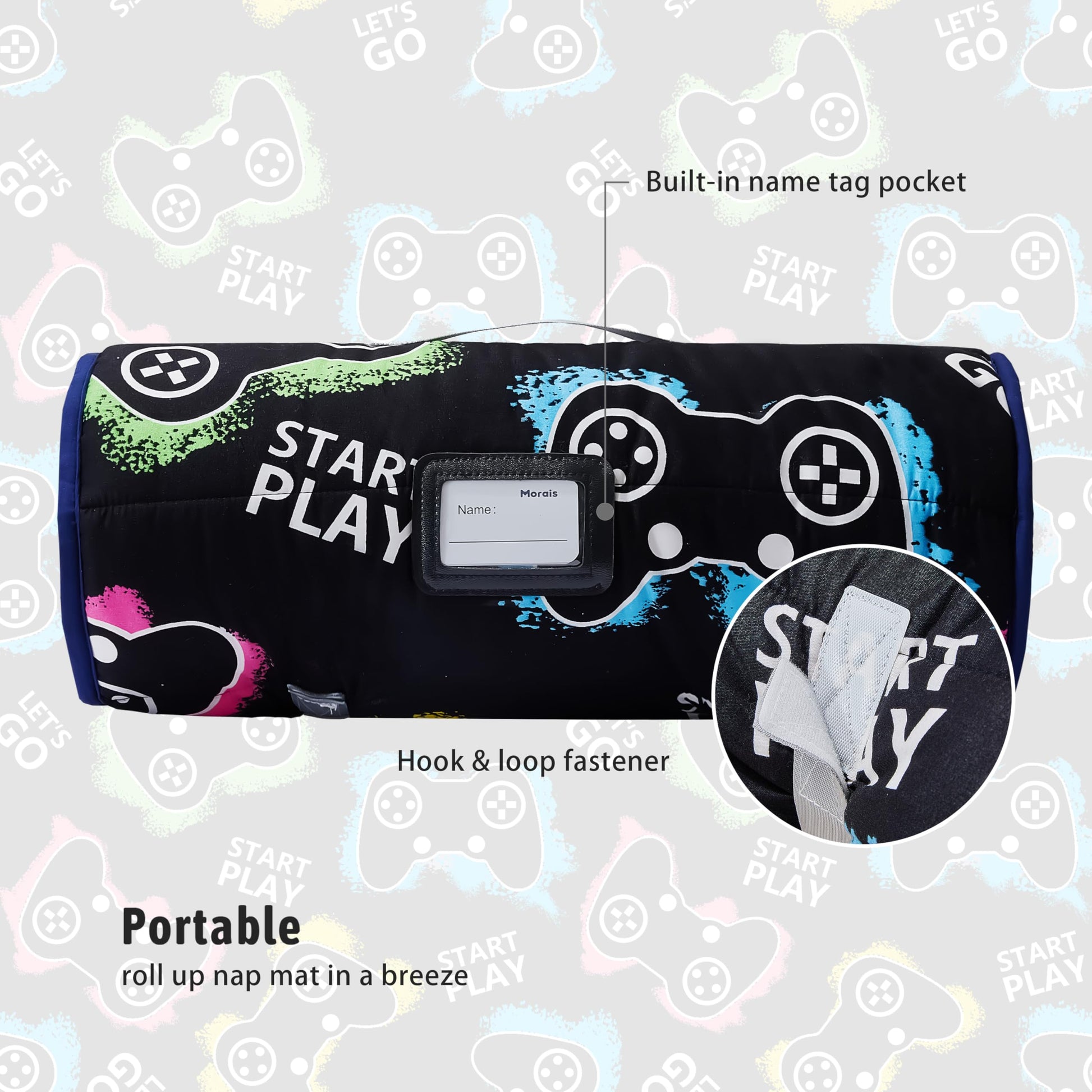 MORAIS Toddler Nap Mat with Removable Pillow and Blanket, Glow in The Dark 52" x 20" Lightweight and Soft Nap Mat for Preschool, Daycare, Travel Sleeping Mat Slumber Bag for Kids (Game)