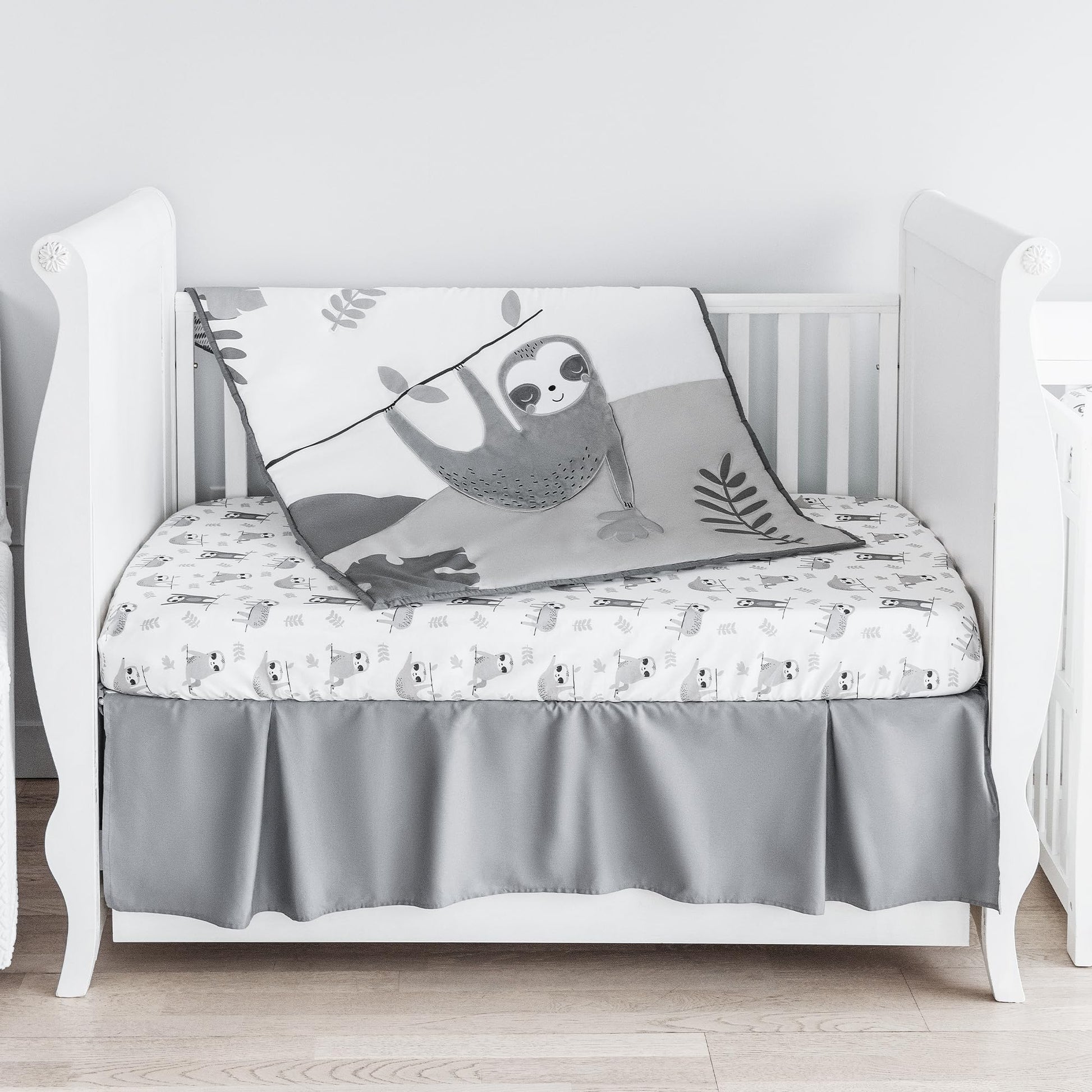 - DESIGNED IN FRANCE: The Little Sloth Collection is designed with a white-grey forest theme, so it perfectly complements woodland nursery decor, jungle-theme decorations, and safari-themed nursery decor. This neutral crib comforter set for boys is one of the best gender-neutral gifts for baby showers, gender reveals, and more.