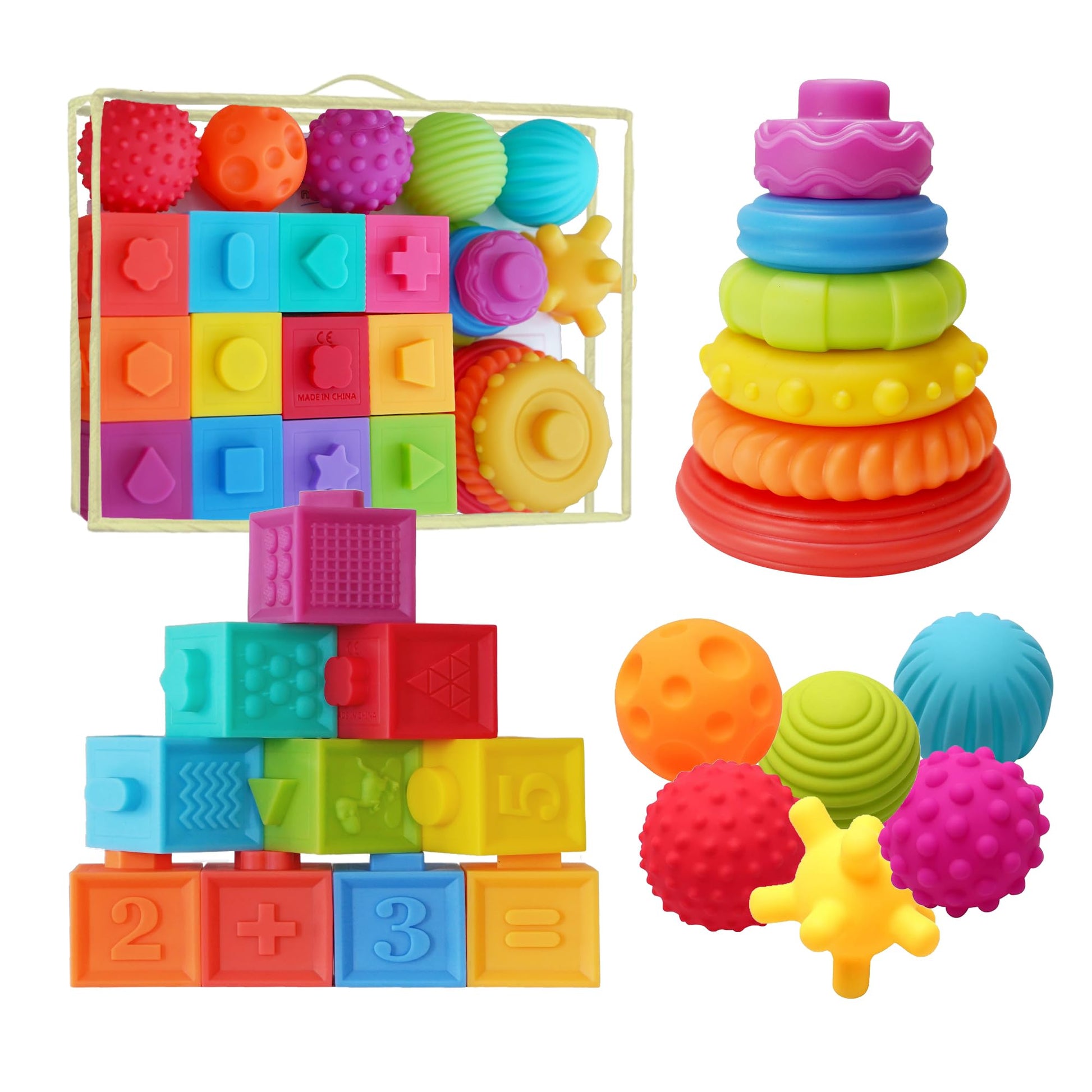 - Diverse Stacking Sensory Toy - These connecting baby building blocks, stacking rings, and textured balls are easy to pick up and stacked together for newborn babies, infants, & toddlers. They will make a squeaking sound when you squeeze the soft and interactive toys. Identifying numbers and various beginner math symbols, colors, and shapes, and having fun along the way!