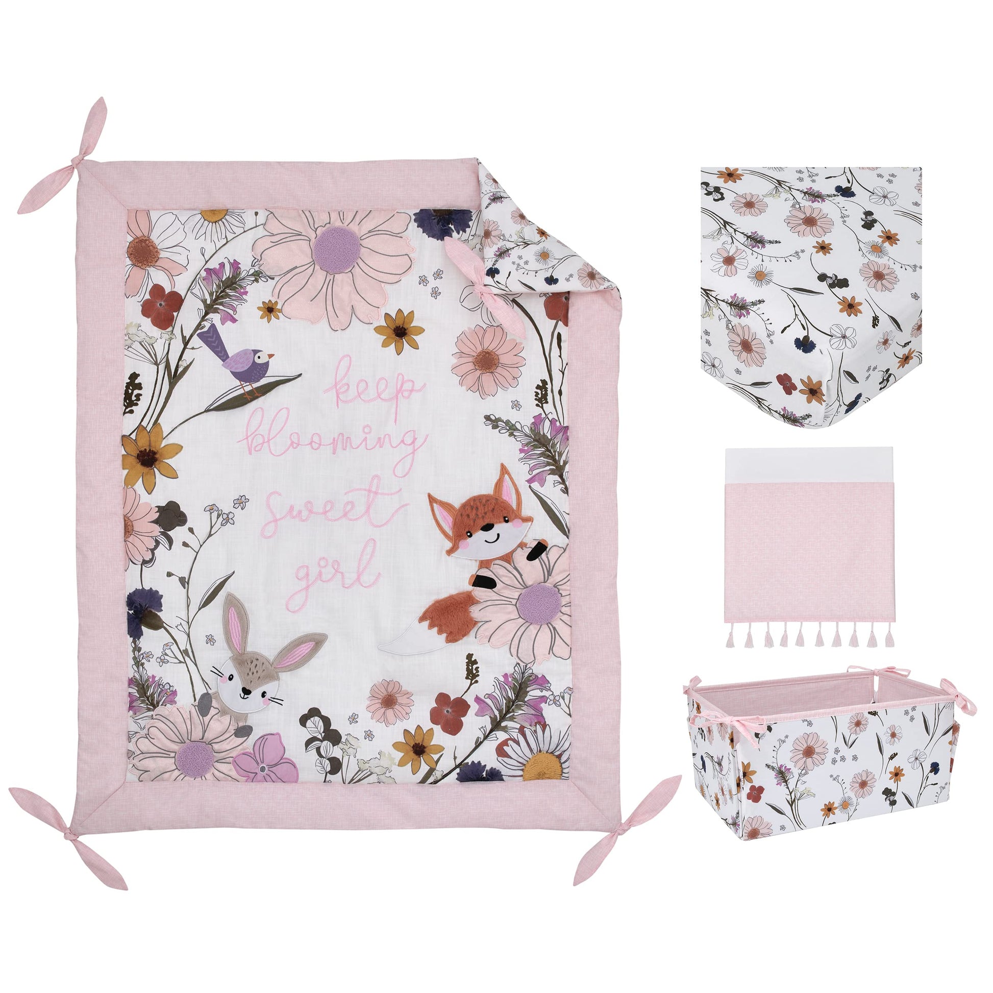 - 4 Piece Nursery Crib Bedding Set includes a comforter, 100% cotton fitted crib sheet, crib skirt, and storage