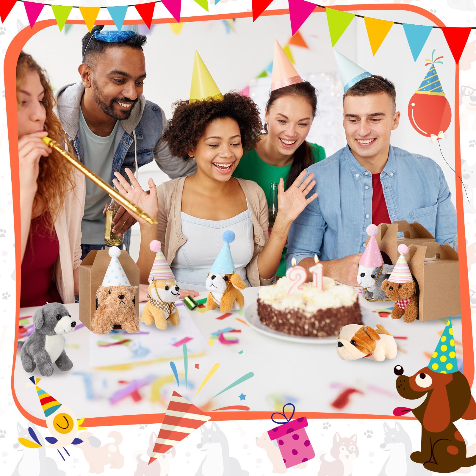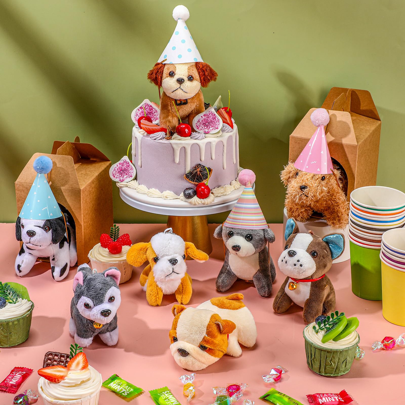 - Package Contents: you will receive 16 mini plush dogs in different breeds and colors, 16 cone cake birthday hats with string and ball and 16 kraft paper open boxes; You can exhibit each mini plush dog in the paper house with a lovely hat; A sufficient quantity will satisfy your needs