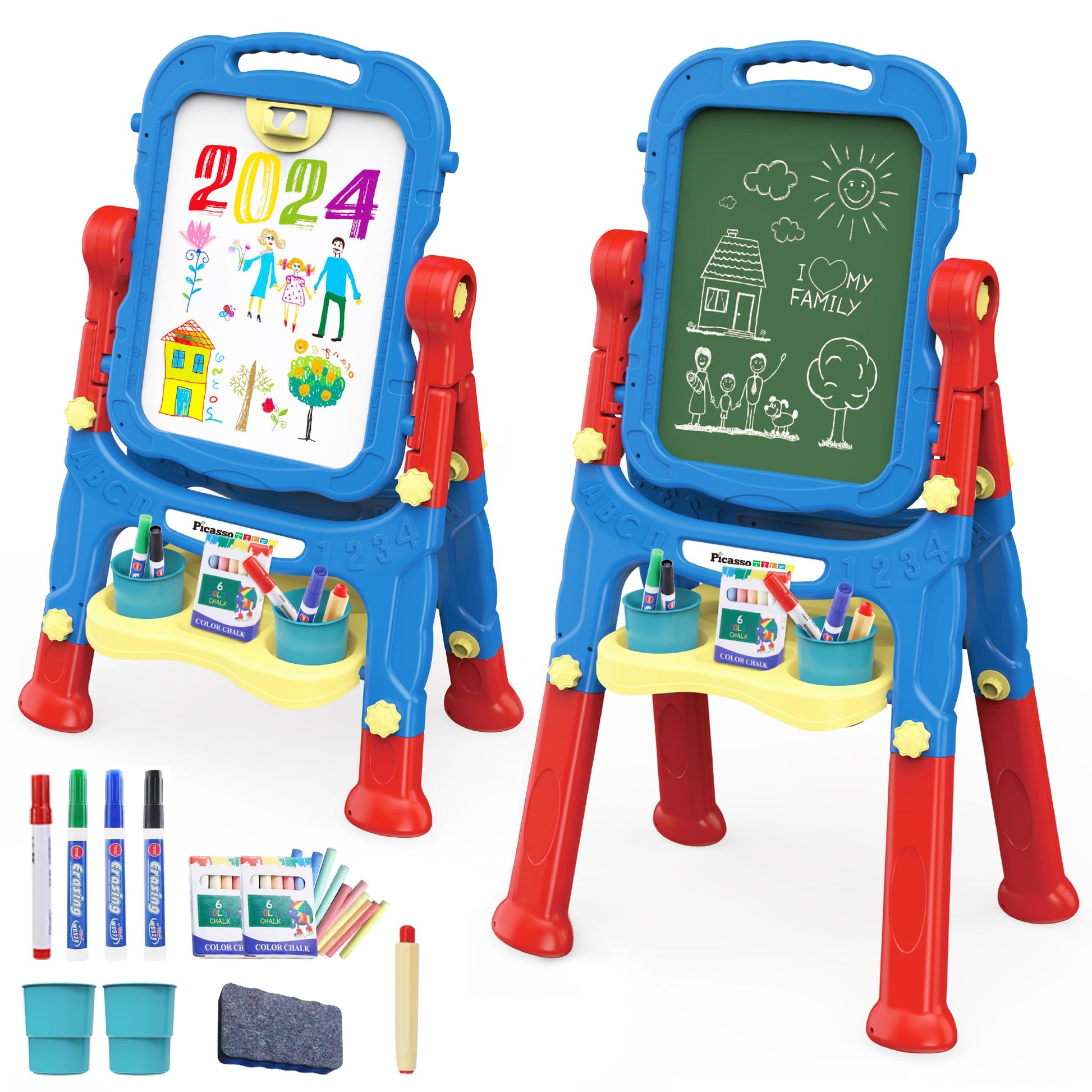 - ADJUSTABLE HEIGHT AND FULL ACCESSORY KIT INCLUDED: This easel grows with your child and adjusts easily using safe, child-friendly knobs. Includes 4 colored markers, eraser, 2 boxes of chalk, chalk holder, 12 magnets, 2 storage cups, and a bottom tray. Designed for ages 2 to 8 and perfect for preschool readiness, creative development, and open-ended art exploration at home, daycare, or school.