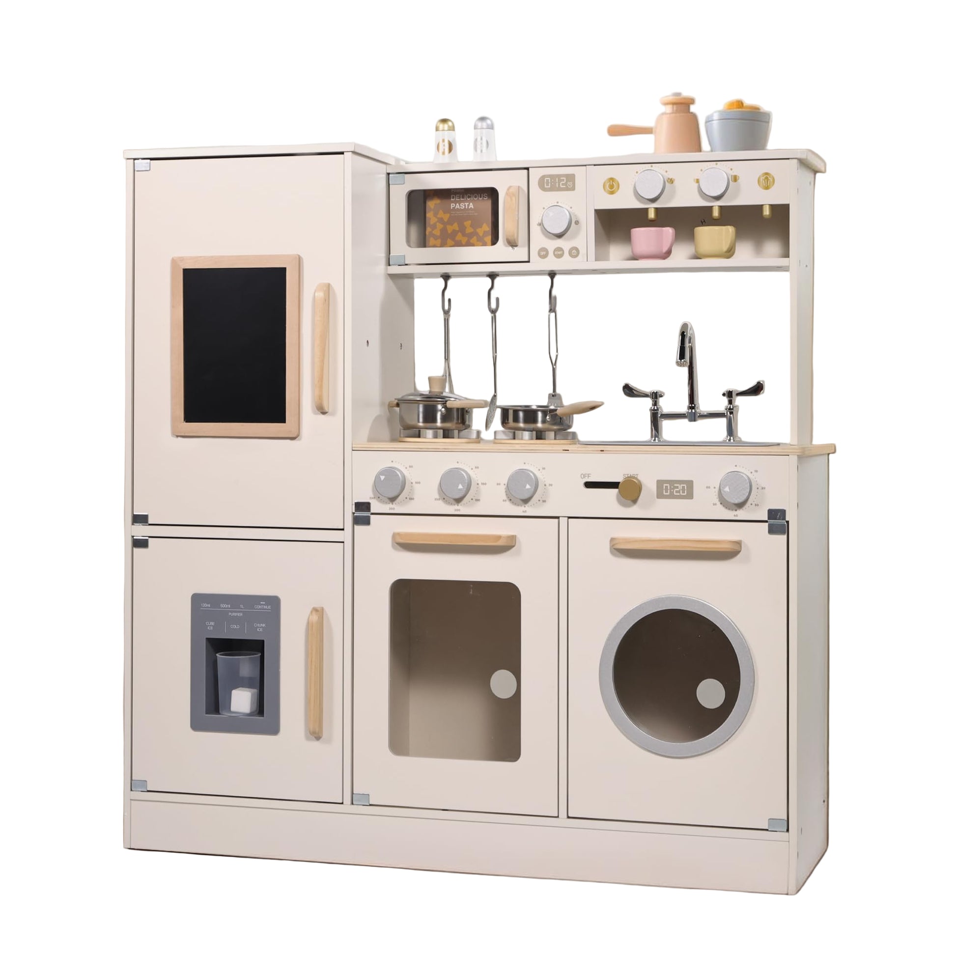 - ALL-IN-ONE KITCHEN EXPERIENCE: Our play kitchen set includes kitchen accessories like cookware, utensils, cups, condiment jars, and comes with functional modules like a refrigerator, ice maker, coffee machine, microwave, and oven, offering kids an imaginative cooking experience and inspiring creativity.