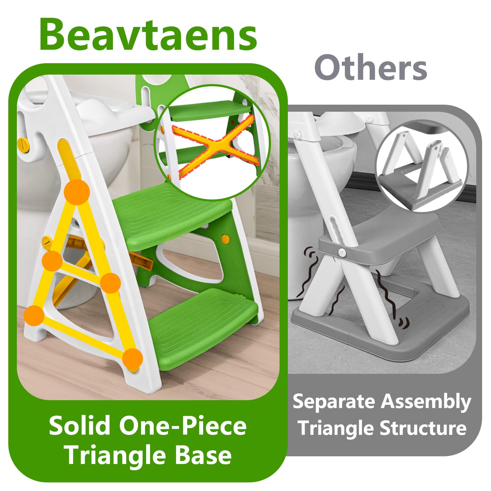 - 【Stability & Non-Slip】: Exclusive patented large triangle structure is more stable,which perfectly solves the ordinary potty seat wobble problem. It can hold up to 200 pounds/90 kg, kids of any age can use it, adults of normal weight can also use it as a step stool. There are non-slip rubber on four feet and seat ring bottom to prevent sliding