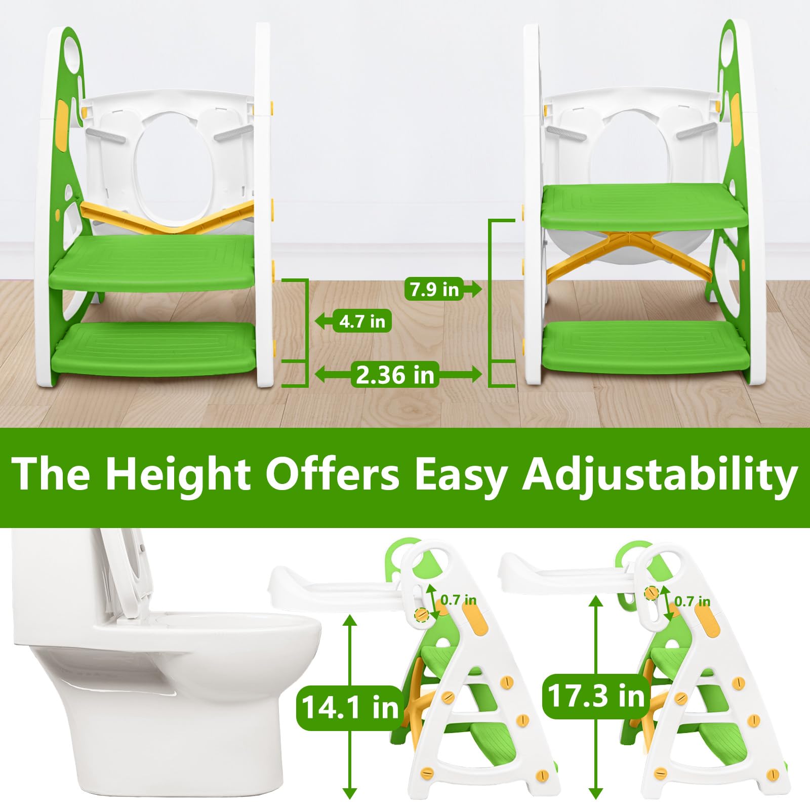 - 【Height Adjustable Design】: Seat height adjusts from 15.7"-17.7" and fits most toilets. The pedal has two heights (7" , 10.2") for different heights kids. The pedal surface expands to 7.7" x 12.6" for kids to easily turn around on it