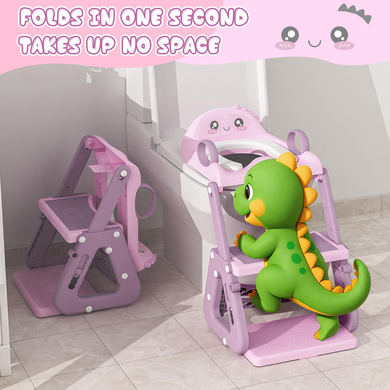 - Comfortable & Fun for Kids - The waterproof padded cushion is gentle on delicate skin and easy to clean, with an extended splash guard for mess-free use. Ergonomic handles provide a secure grip, and the fun and cute dinosaur design makes potty training an enjoyable journey for your child, encouraging them to use their potty training seat with excitement. Bright colors turn this toddler potty into a happy part of daily life.