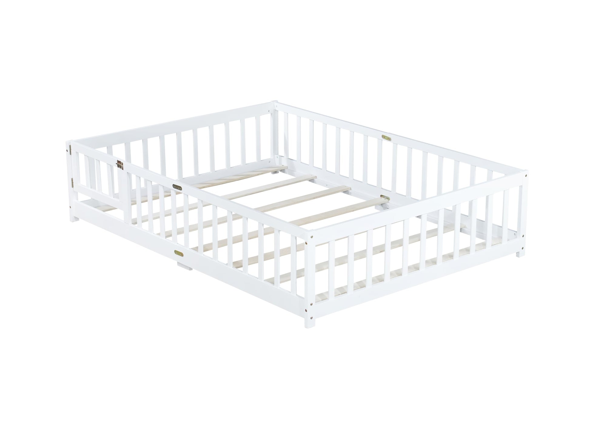 Full Size Floor Bed with Fence and Door,Rubber Wood Floor Bed w/Safety Guardrails/Near