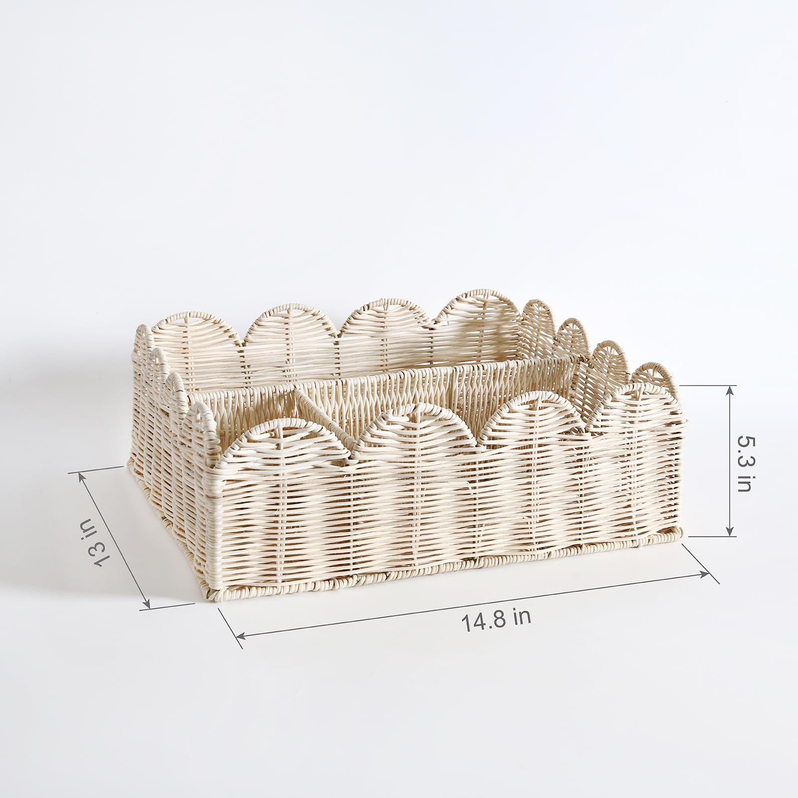 - Woven divided basket: 15 x 13.2x 5.3inch.The scalloped basket has 4 compartments,making it easier to organize, large and sturdy design for more storage and cute appearance will add a breath of vitality to your home, create a warm and simple living environment.
