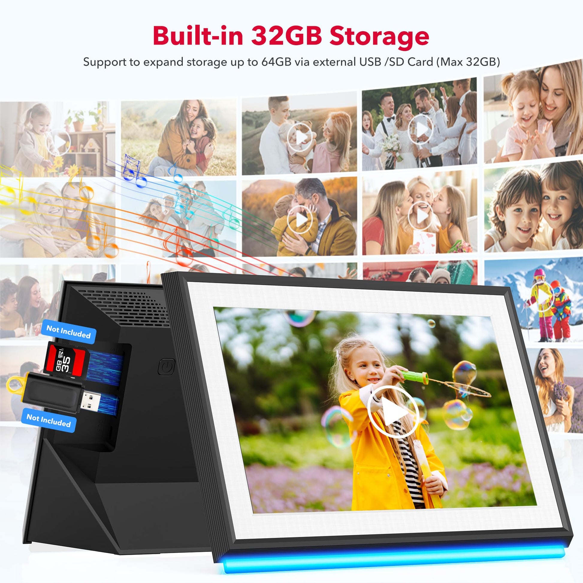 - Built-in 32GB Memory with Expandable Memory: The RCA Digital Frames for photo features 32GB of memory, which not only stores over 60,000 photos but also allows you to expand the memory to 64GB by connecting an external USB drive or SD Card. It can also directly play pictures and videos from the additional USB drive or SD Card. (Additional USB drive and SD card are not included in RCA digital Frame Package)