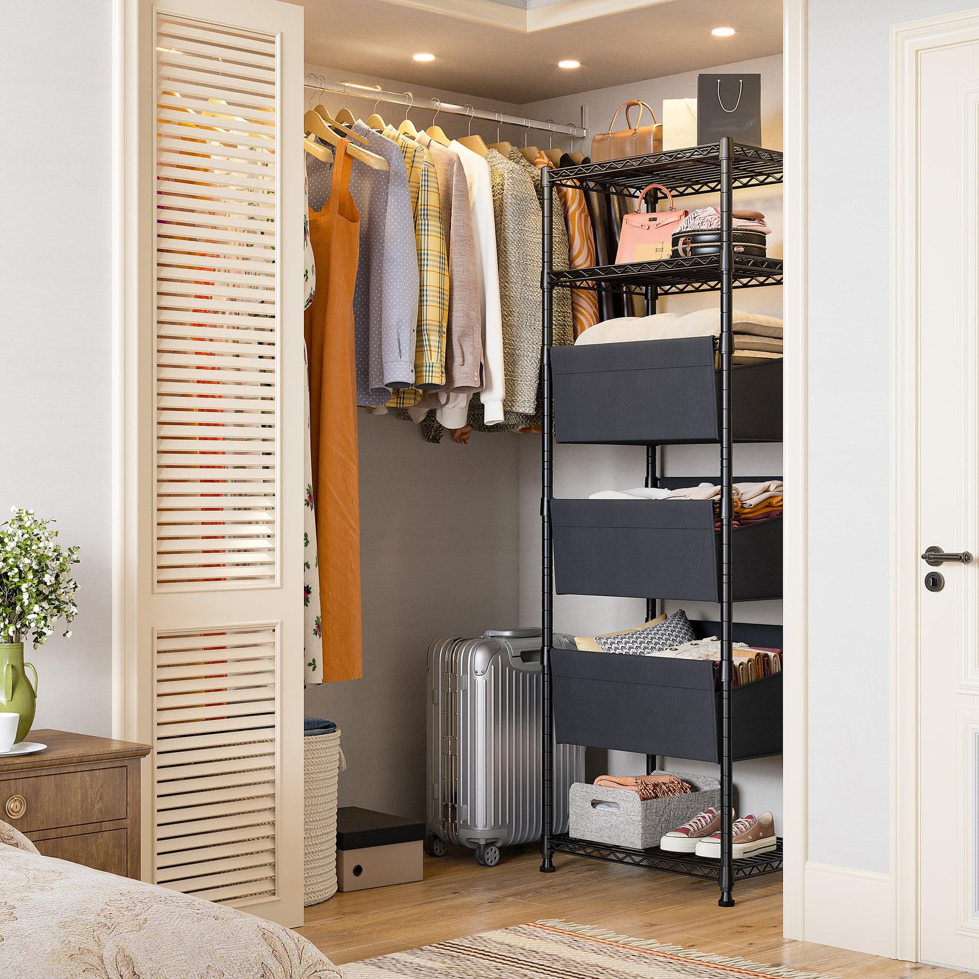 - Our storage shelf has 3 baskets with pre-installed base plates that are more load-bearing. Besides, the tilted design basket of this pantry shelf is easy to reach items. Compared with the full wire shelf, the basket can prevent items from falling off. Do you struggle to keep the samll items organized in small space? Elevate your home organization with a premium storage rack.