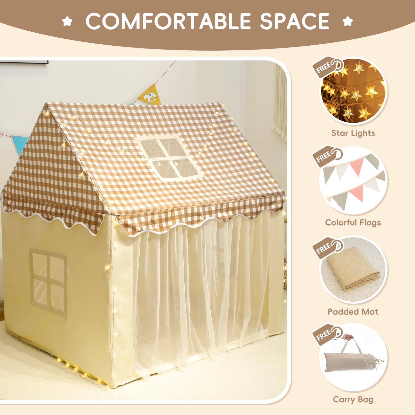 - šćINCLUDED ACCESSORIESć:The kids play tent included include a tent cloth cover, poles for building, a detachable and washable Padded Mat, a star light, and a decorative flag, providing a more comfortable and beautiful space for children