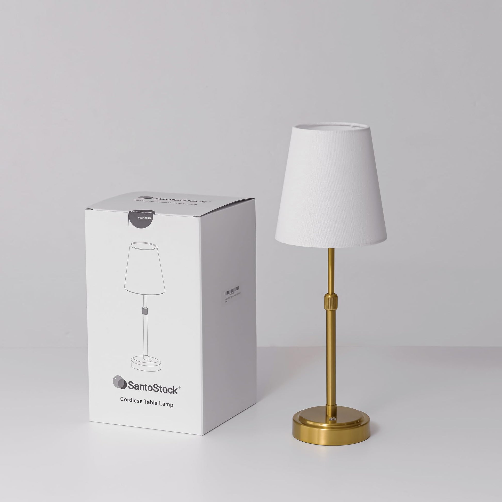 - The metal round tube can be adjusted, the Total height of this wireless lamp is 14” H to 19” H. The brass metal body & white fabric shade, which is more elegant and textured under the soft light, is suitable for living rooms, bedrooms, dining rooms, coffee bars, balconies, porches, hallways