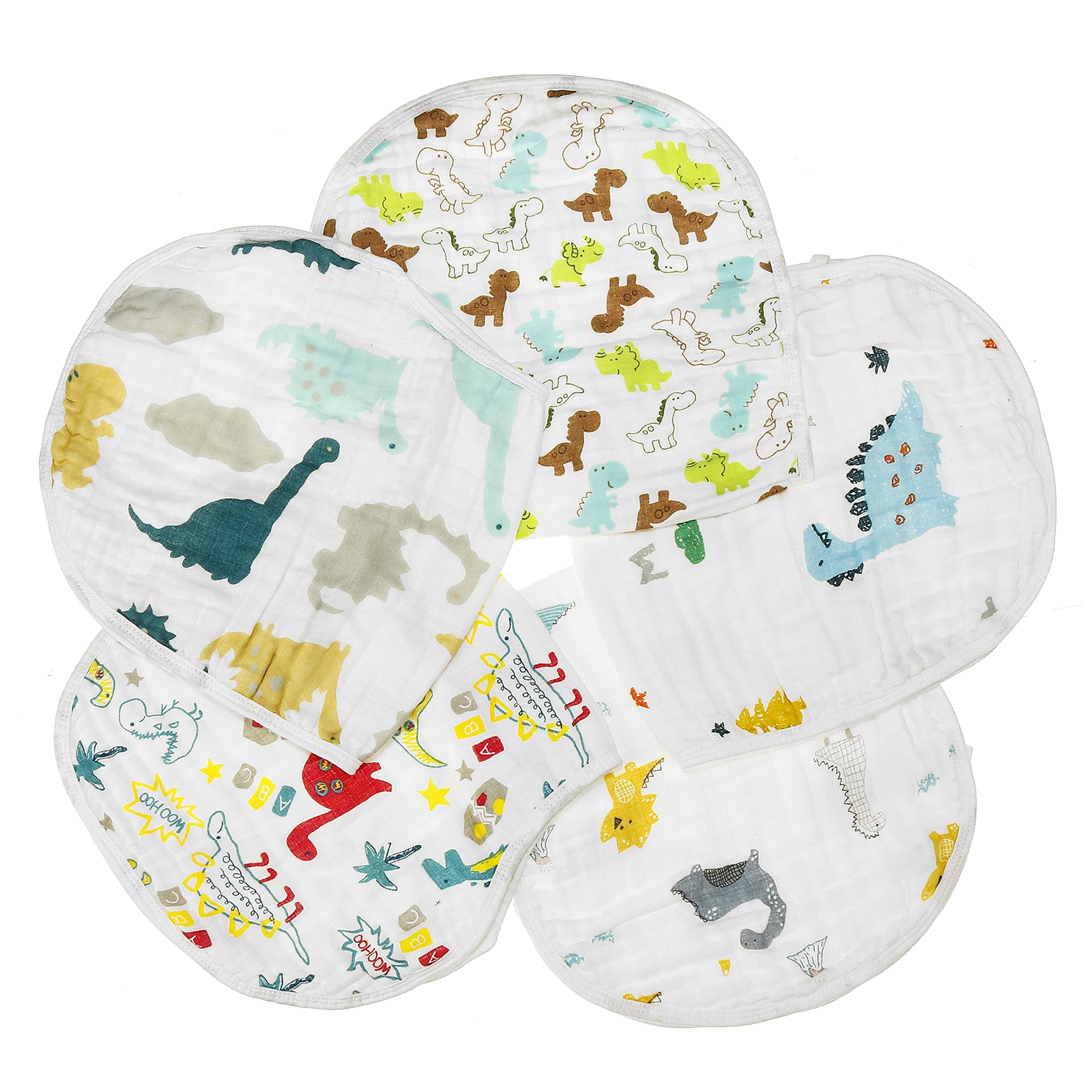 - 5-PACK: 5 Pre-Washed Unisex Cotton Muslin Burp Cloths with Snap buttons for Infants. Bulk packing. Attractive gender neutral Dinosaur prints on a white background. Suitable for a boy or girl.