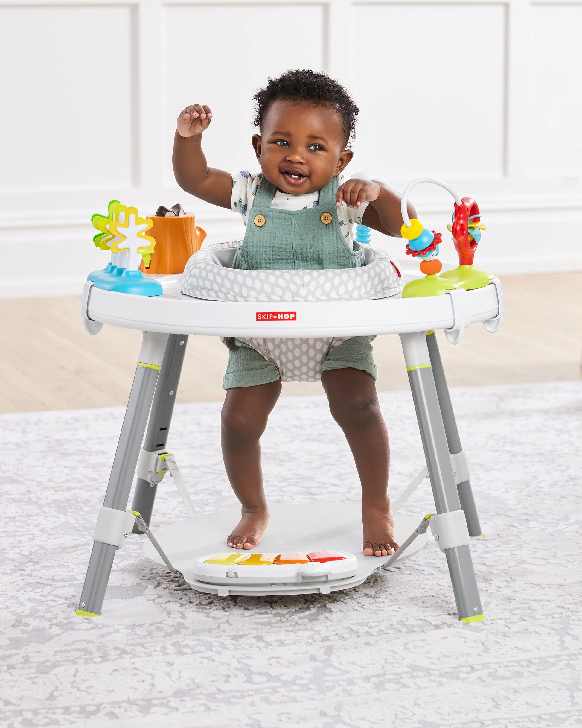 - Adjustable Design: The 360-degree rotating seat turns for bouncing and includes toy loops to attach toys. The foot support platform adjusts to the perfect height for your baby. Coordinates with the Skip Hop Explore & More collection