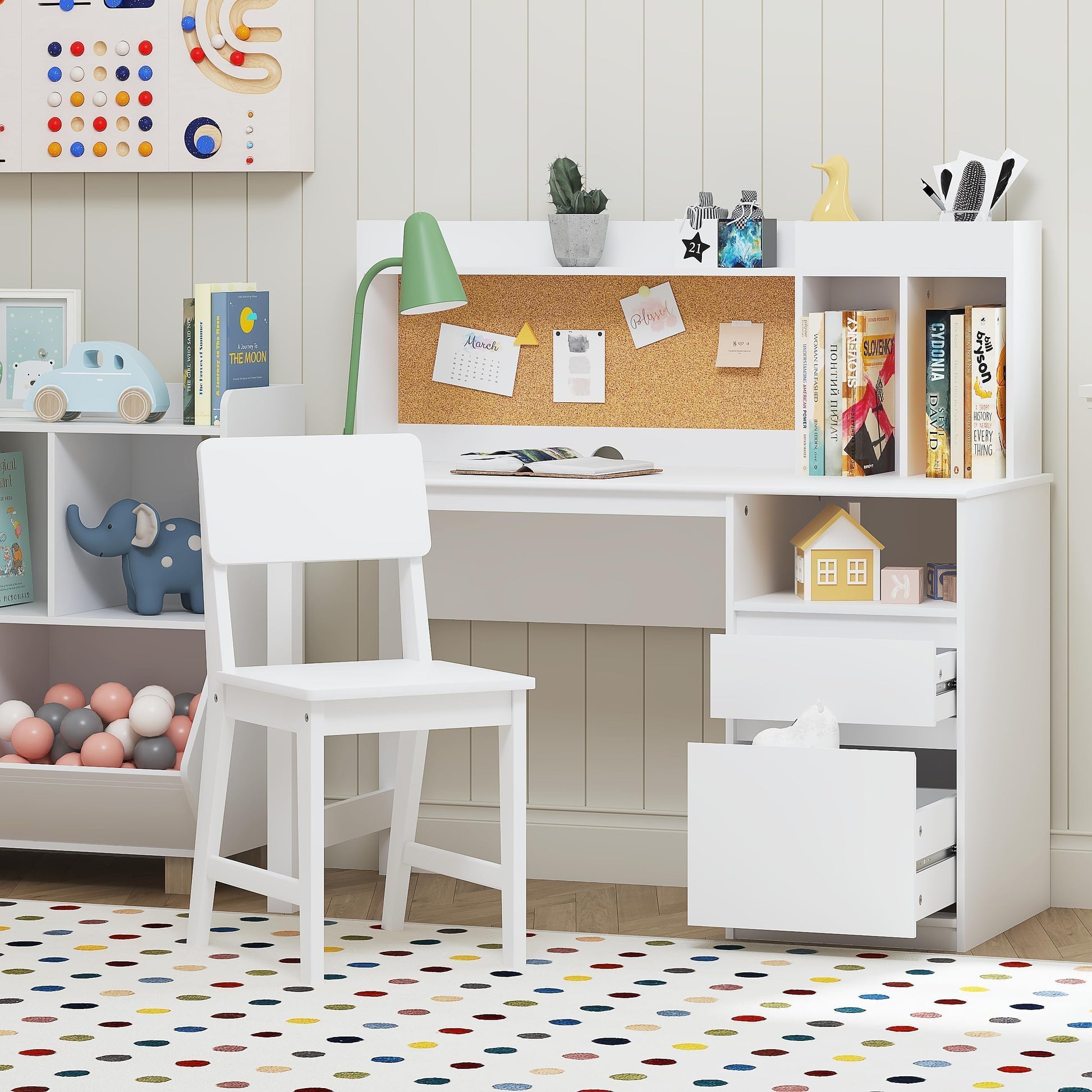- This kids' study desk features top shelf and storage box for display decors, 2 compartments designed to organize books, documents, and other school supplies. The bulletin board surface allows kids to pin up pictures, drawings, and important notes. Additionally, 2 drawers holds personal belongings for privacy.