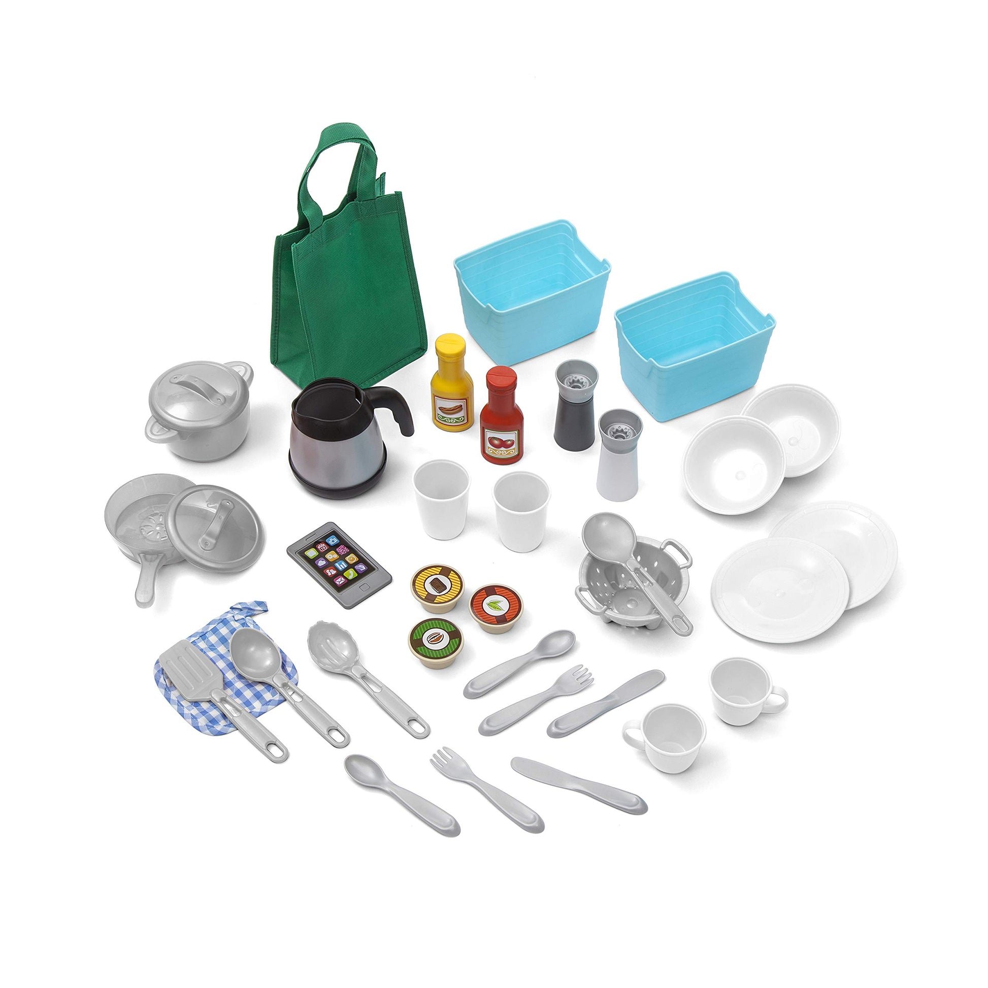 - INTERACTIVE TOYS: Realistic lights and sounds, 33-piece toy kitchen play set, enhance playtime with pots, pans, silverware, coffee pot, storage bins (food and batteries not included)