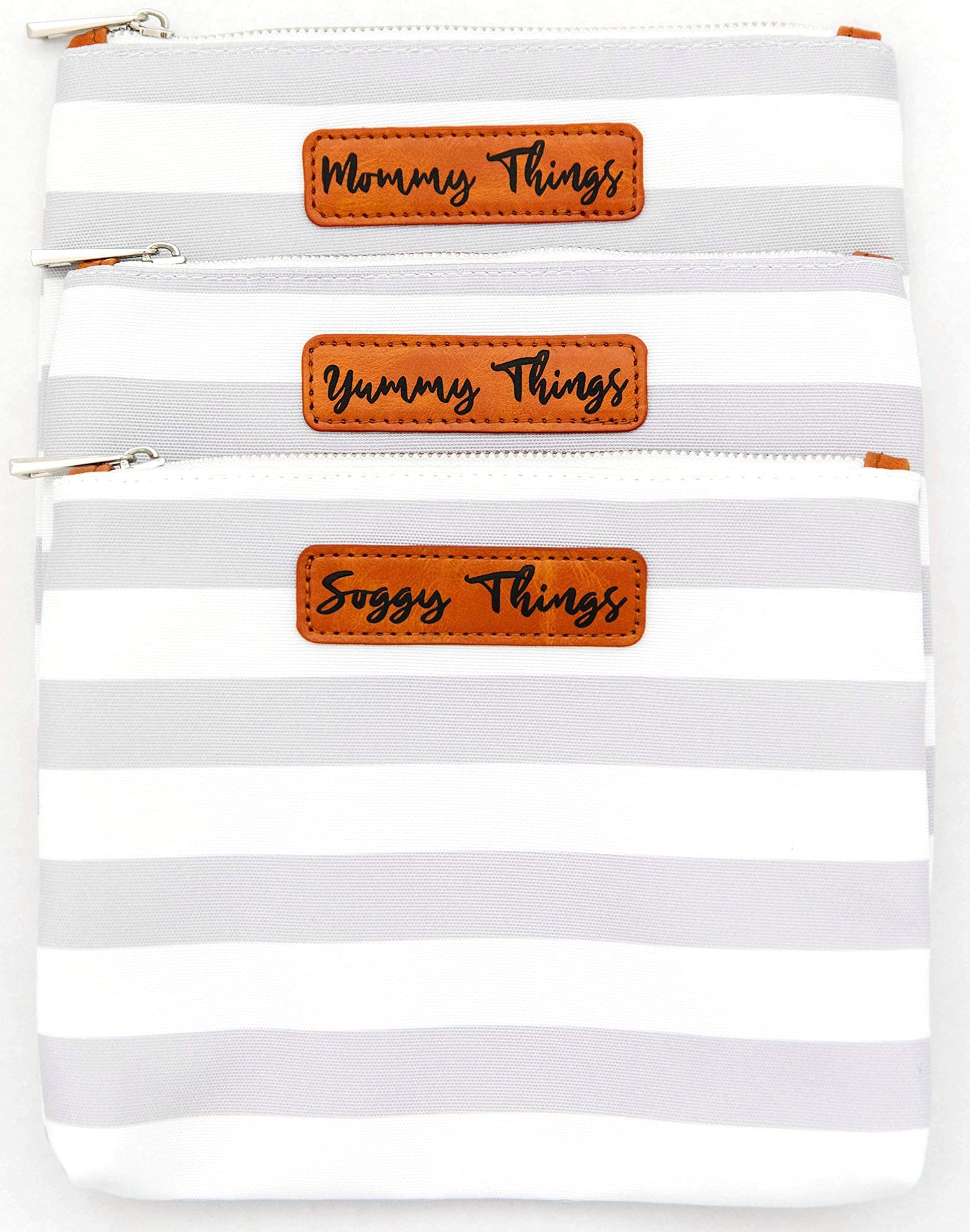 - We Made It Super Easy To Find What You Need: Every baby diaper organizer comes with leather embossed labels, so finding what you need is a breeze; "Cheeky Things" for diapers, "Yummy Things" for bibs, spoons, and snacks, "Mommy Things" for your essentials, and "Soggy Things" for an extra outfit or a dirty diaper