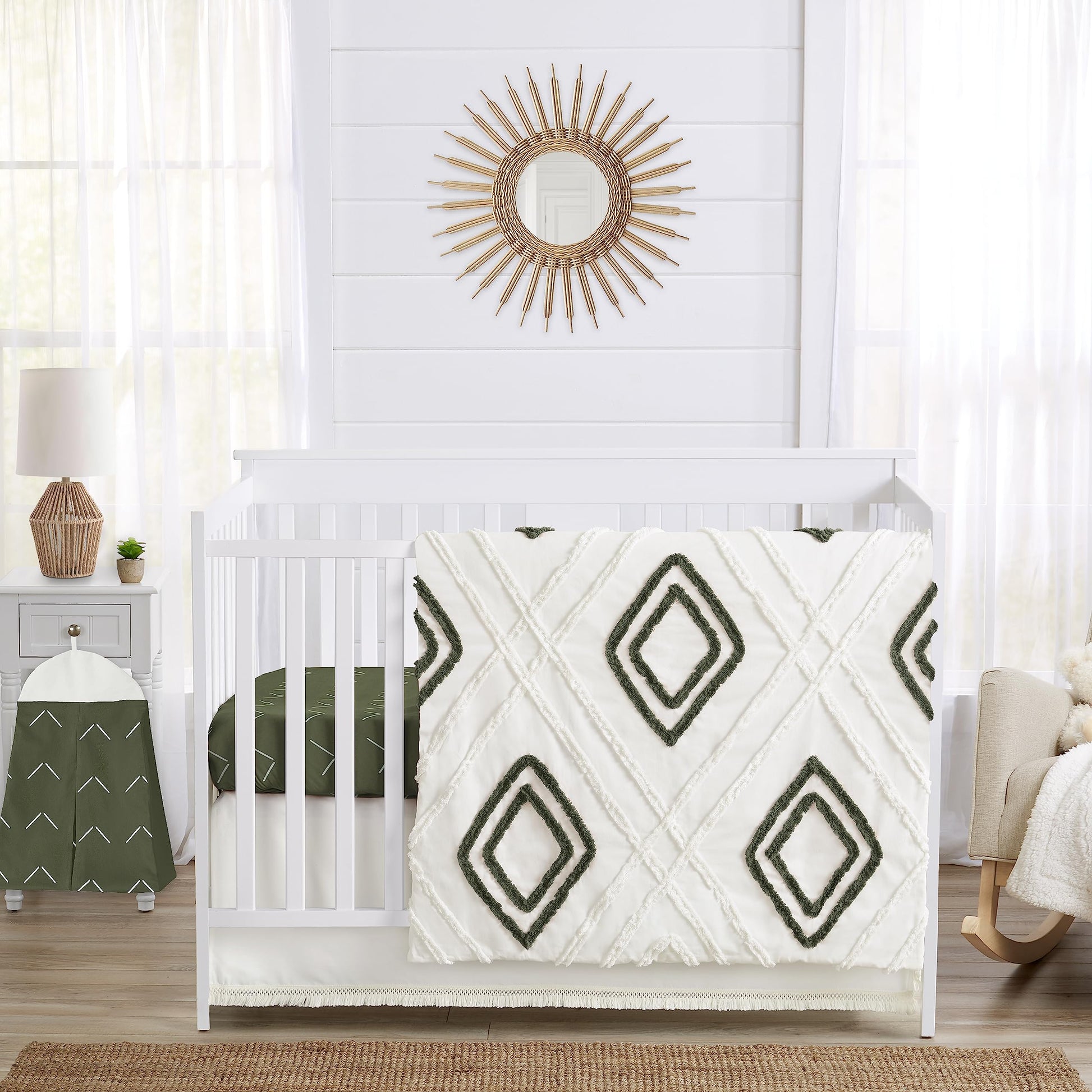- 4 PIECE CRIB BEDDING SET INCLUDES: Crib Comforter (45in. x 36in.), Fitted Crib Sheet (52in. x 28in. x 8in. Pocket), Crib Skirt (52in. x 28in. x 15in. Drop) and Diaper stacker (15in. x 20in. x 6in.). An infant crib set including all the baby essentials is a great value compared to purchasing pieces separately. This baby crib set is made of cotton & soft microfiber fabric & features the minimalist color palette of forest green & ivory to bring your gender neutral boho themed baby room together.