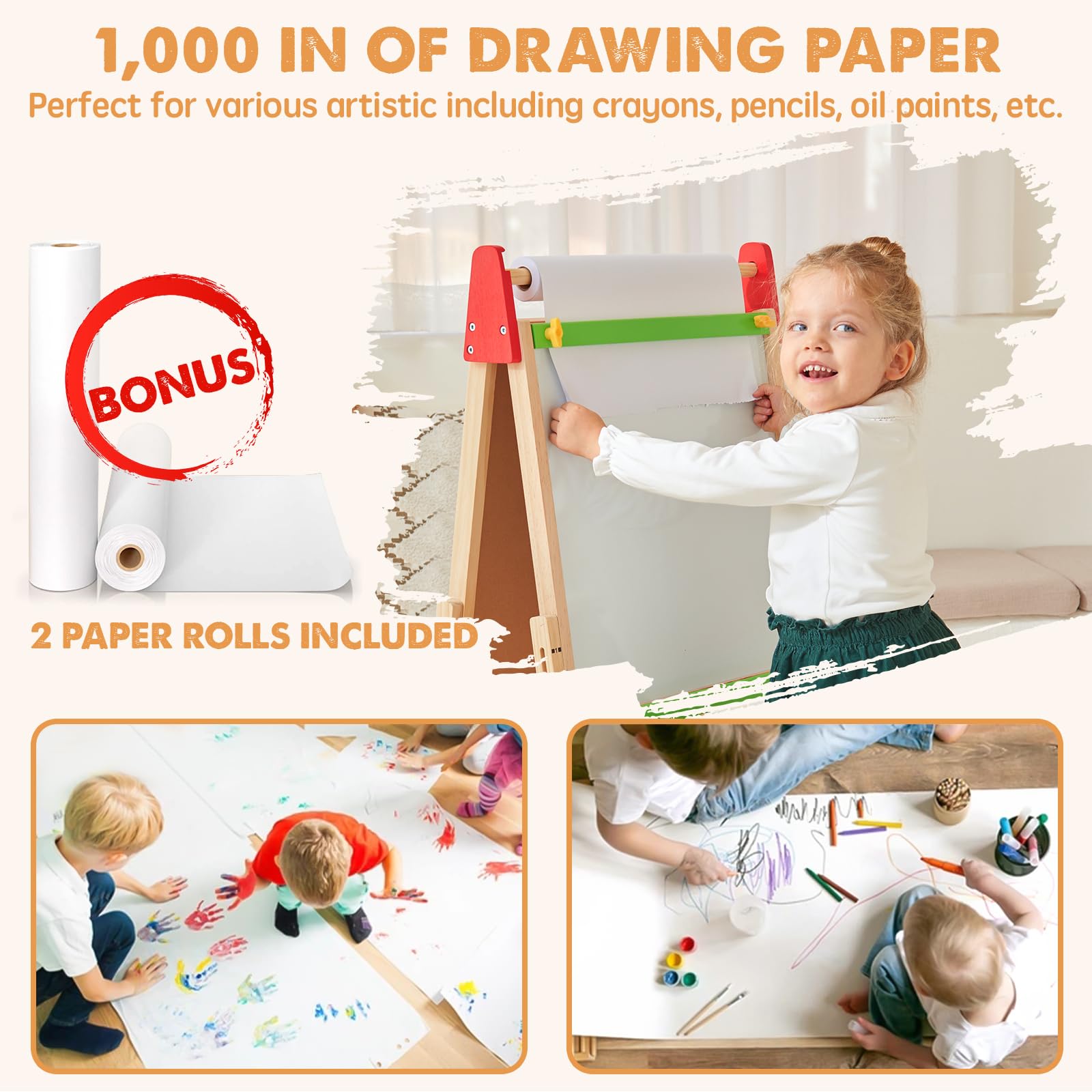 - All in One and 2 Drawing Paper Roll: This pine wooden kids easel includes a magnetic dry-erase board, chalkboard, locking paper-roll holder, wooden trays, 3 painting cup, and paper roll ( 15"*983" in total). It's a screen-free, learning toy for children aged 3+.
