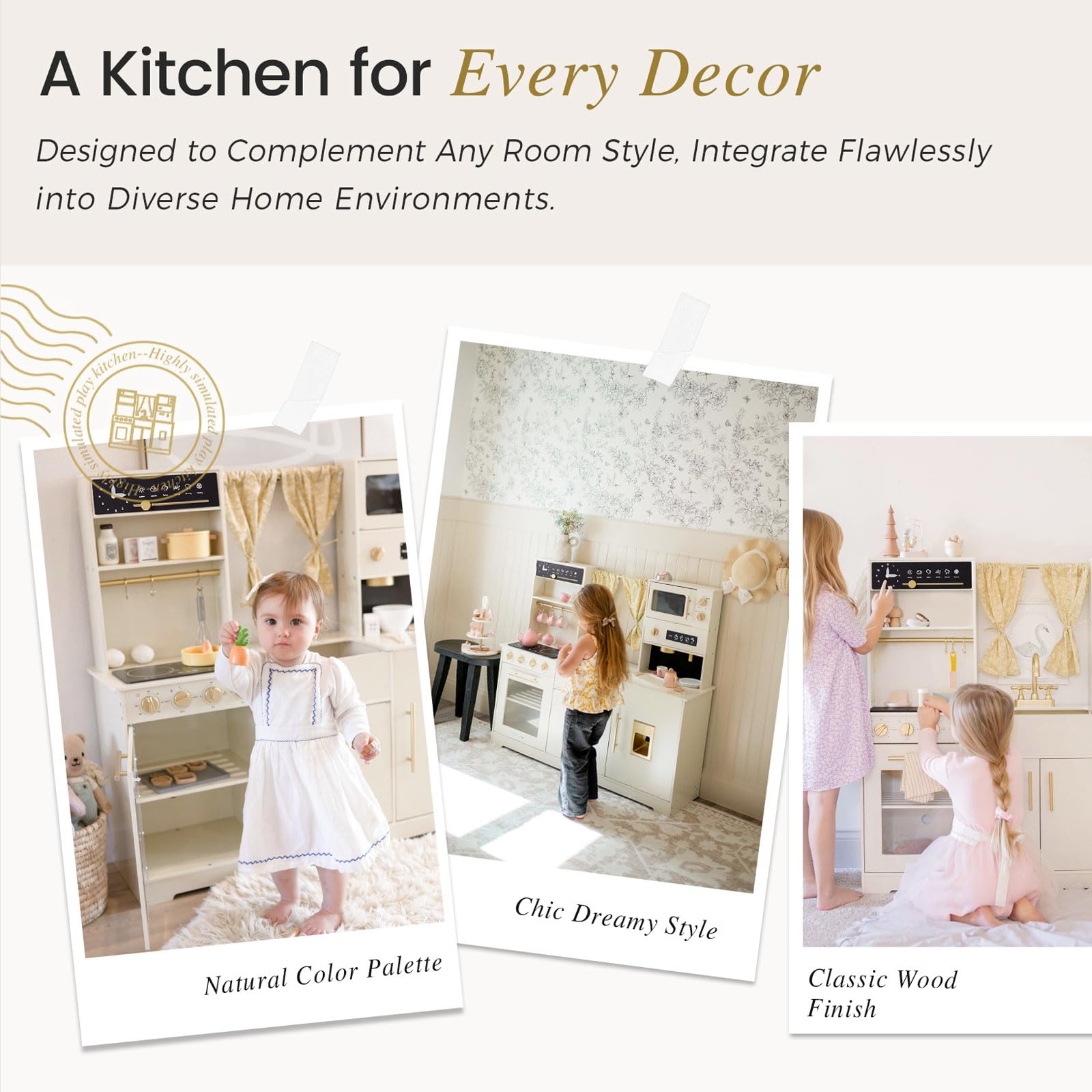 Tiny Land Play Kitchen for Kids, Toy Kitchen Set with Plenty of Play Features, New Modern Kids Wooden Play Kitchen Designed in Trendy Home Style with Curtains, Gift for Ages 3+