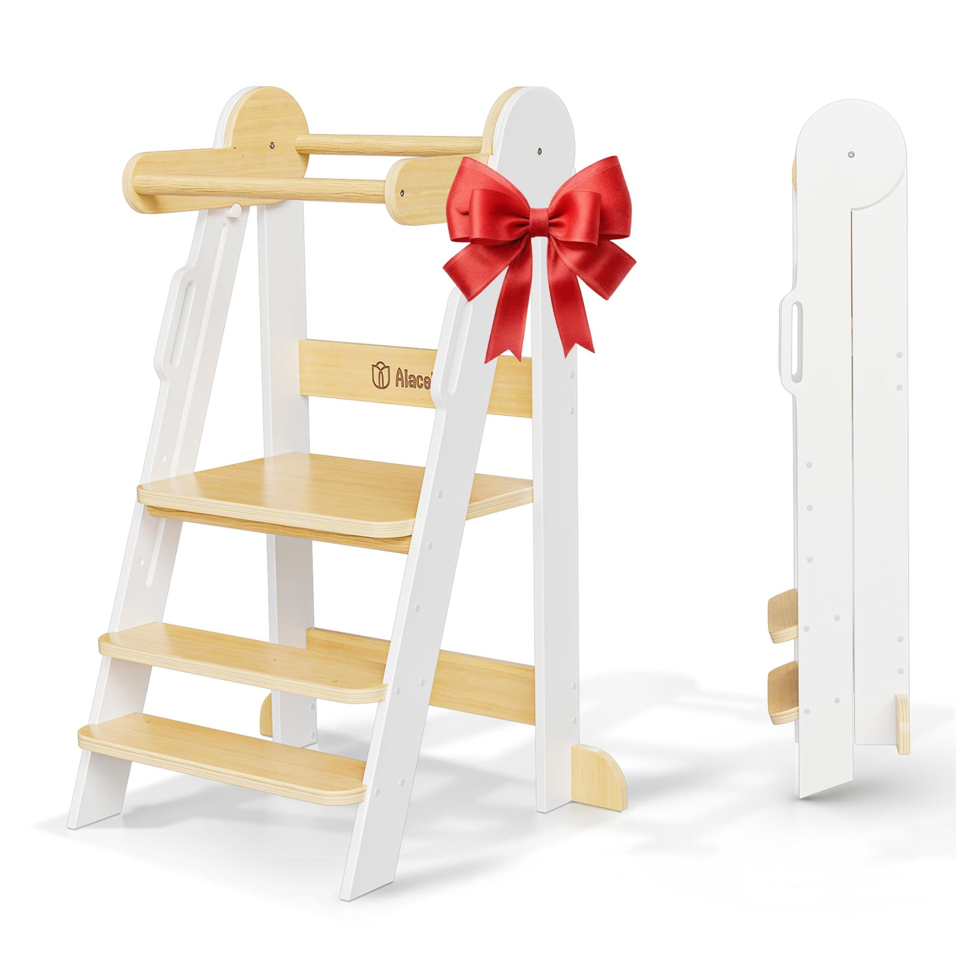 - GUIDE KIDS TO INDEPENDENCE with the Alacebelle Toddler Kitchen Stool Helper. This foldable kitchen stool for kids has a white and natural wood design that fits well in your home decor and creates a calm space for your child to learn and explore