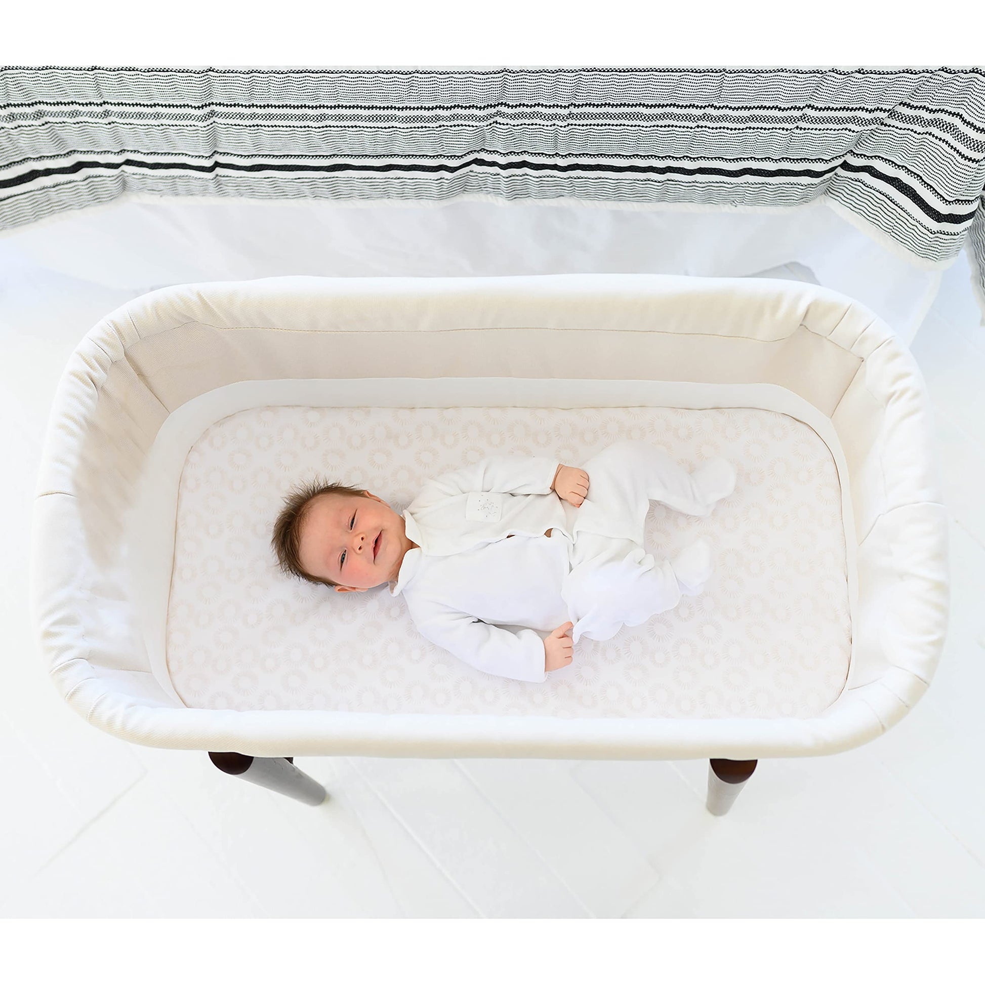 - Safety in Mind: The TruBliss Sova Bassinet prioritizes your baby's safety with its extra deep breathable fabric walls, creating a secure and cozy environment for your newborn. This bassinet is not only functional but also stylish, featuring beautifully tapered solid Beech wooden legs with brushed brass tips. It comes with a padded, vinyl-covered foam mattress pad and two fitted sheets that are machine washable, making it suitable for even the messiest newborns.