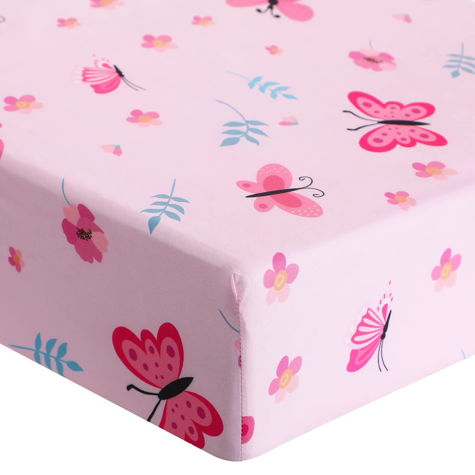 Tudomro 3 Pieces Butterfly Nursery Crib Bedding Set for Girls, Standard Size Bedding Sets with Comforter Fitted Sheet Crib Skirt(Pink)