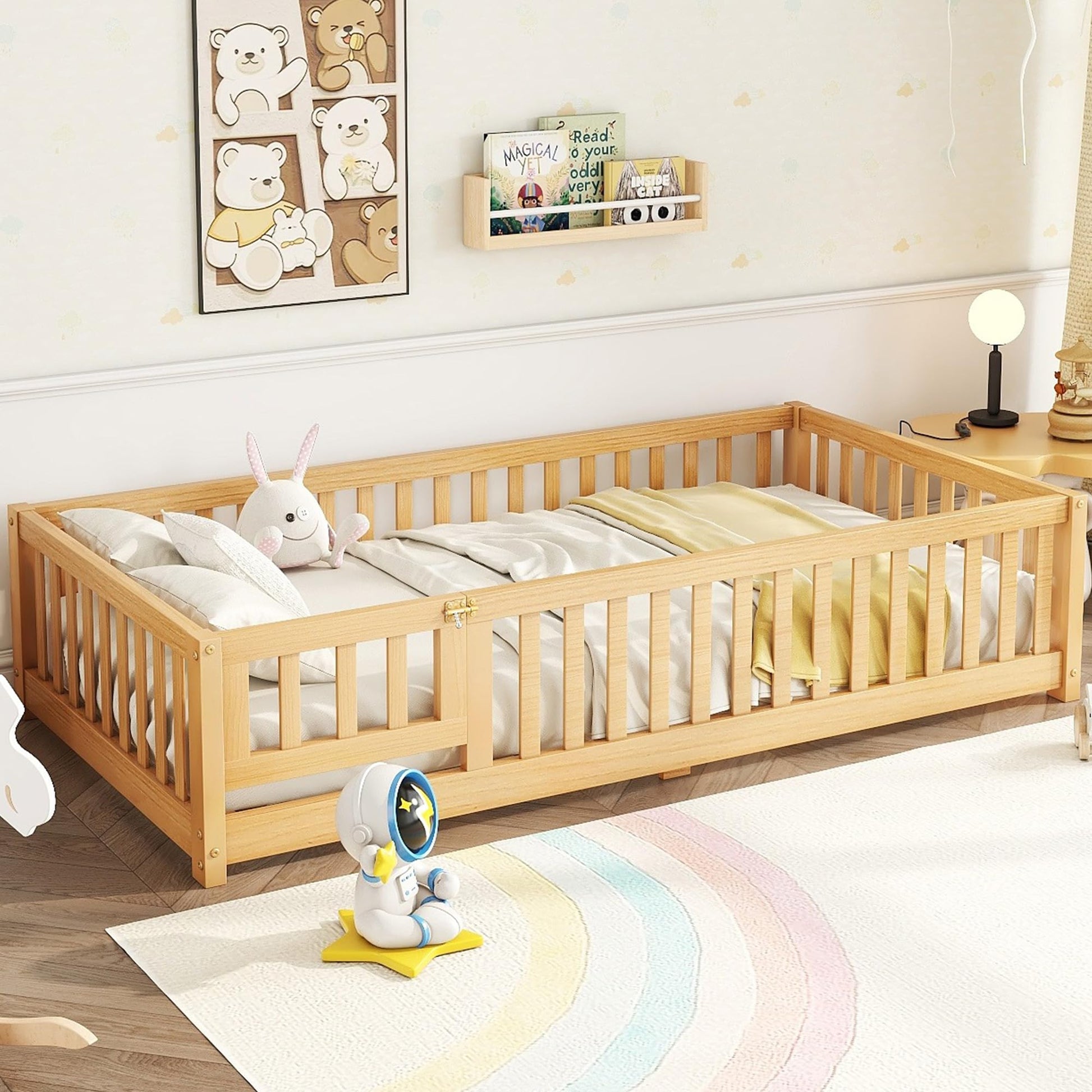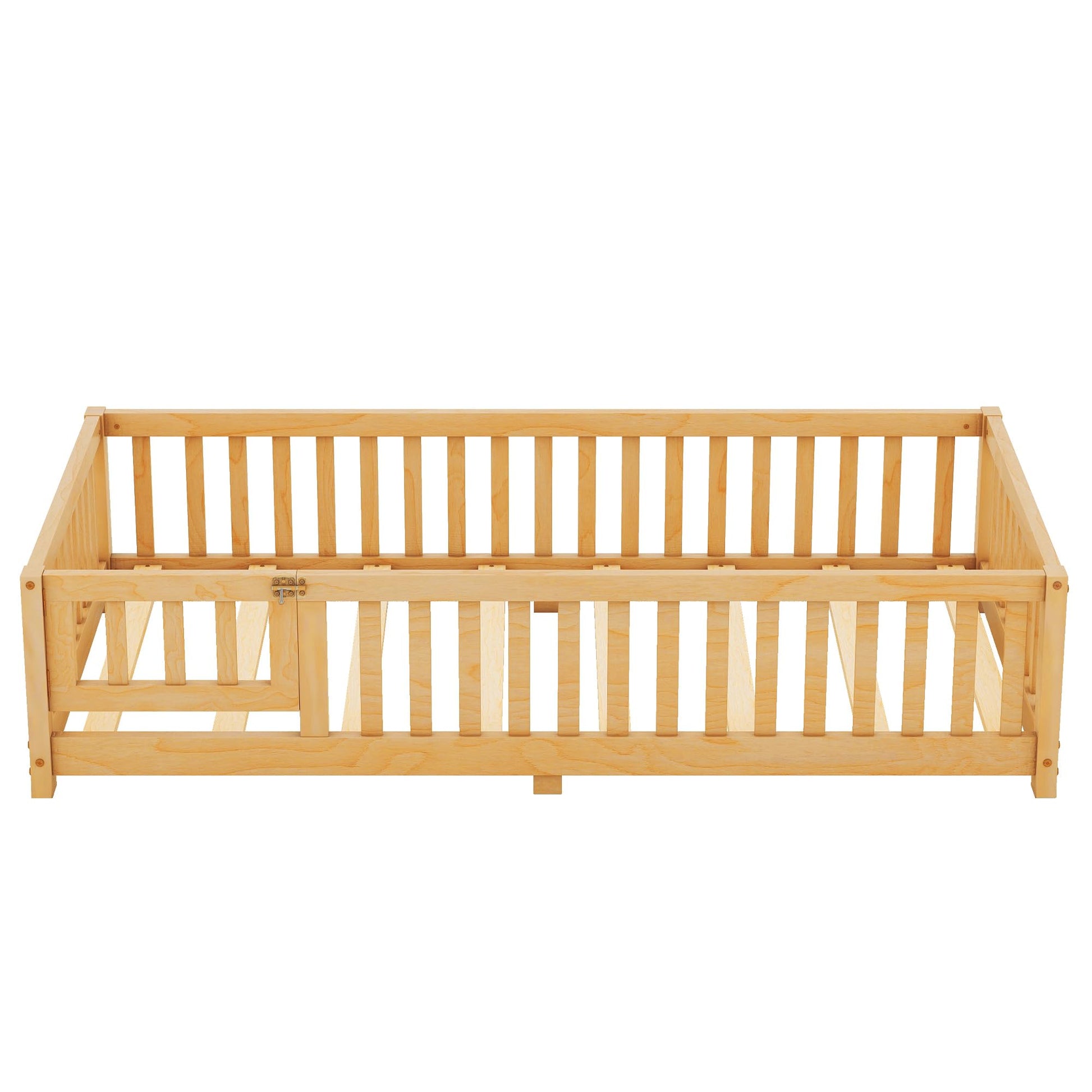Twin Floor Bed with Slats and Door, Twin Size Montessori Floor Bed with Fence