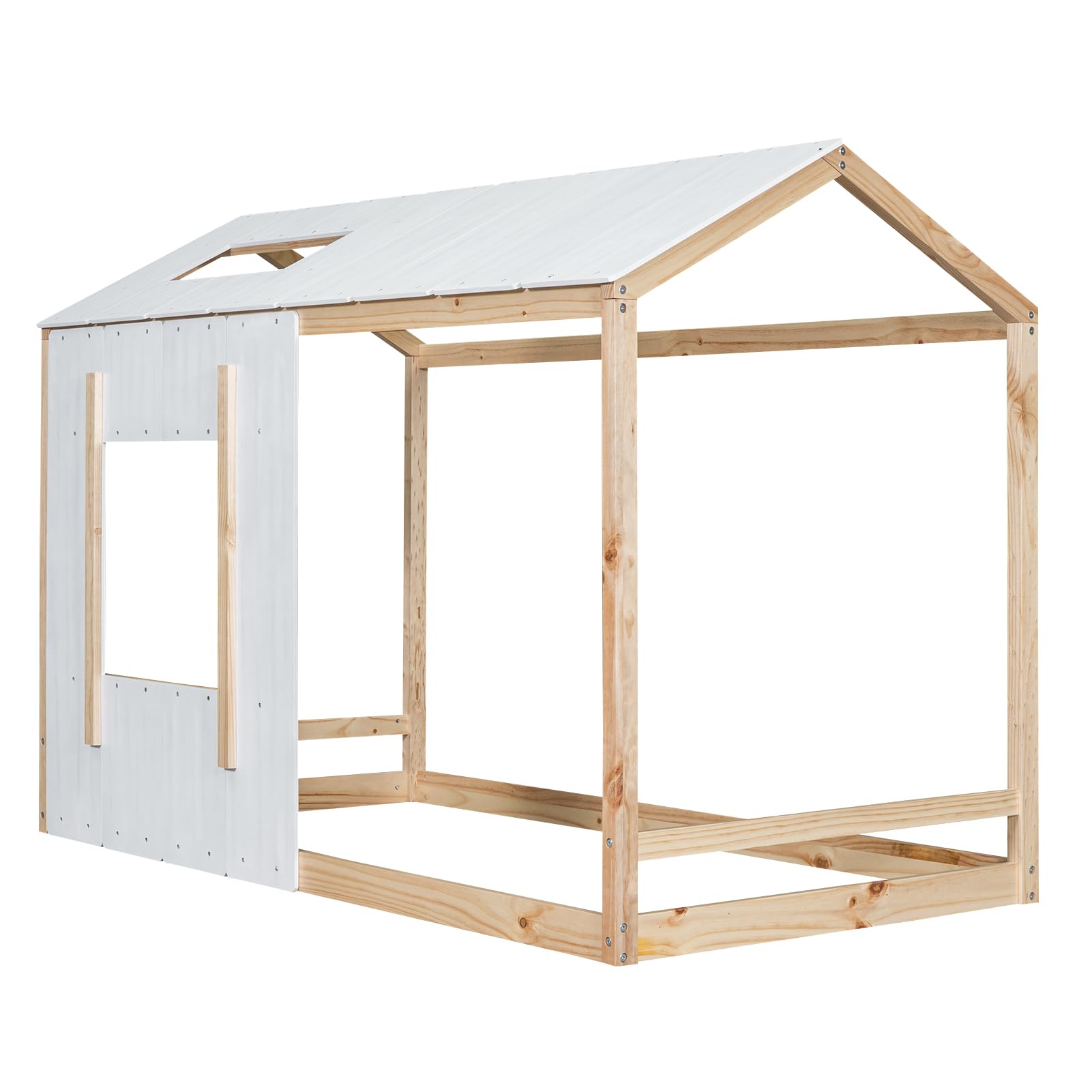- This montessori floor bed twin size has a distressed design, which gives a very special feeling and makes this montessori floor bed unique. The house-shaped of the eaves, simple and open concept gives your kids creativity free reign. You can not only decorate this cute montessori bed frame with your kids, but also can put tents on, so your kids will have their own private space.