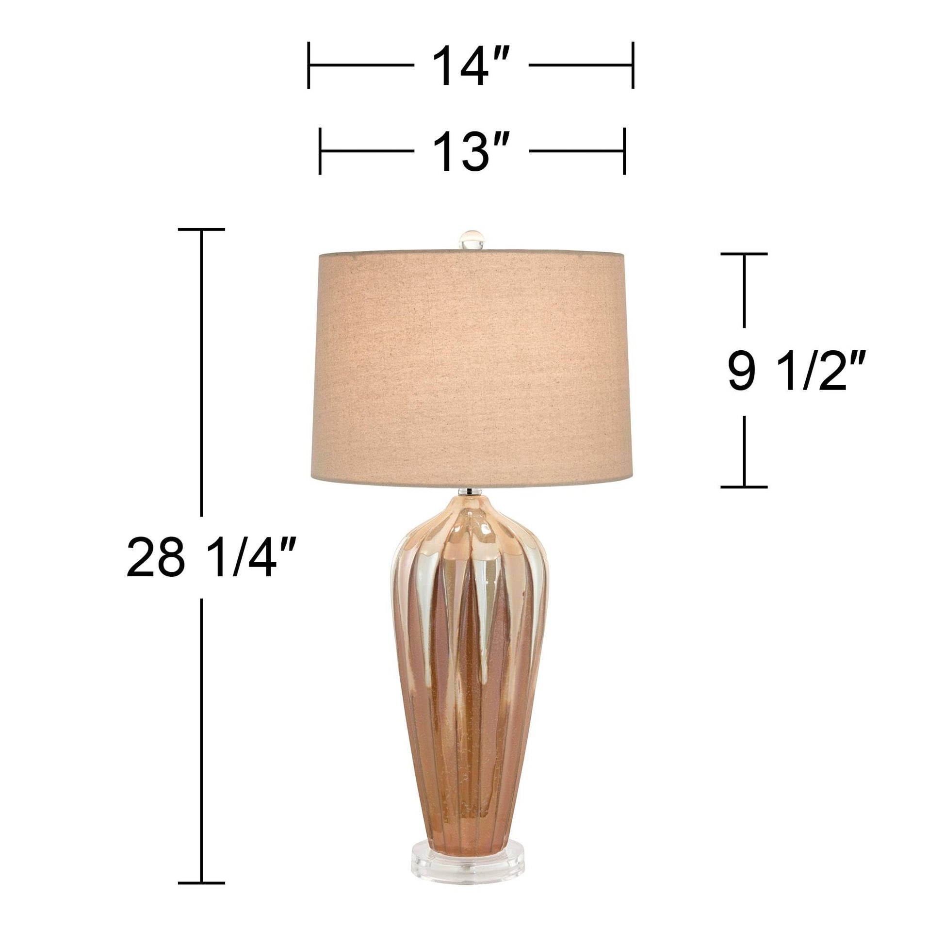 - Set of 2 lamps. Each is 28 1/4" high overall. Shades are 13" across the top x 14" across the bottom x 9 1/2" high. Weigh 6.2 lbs.